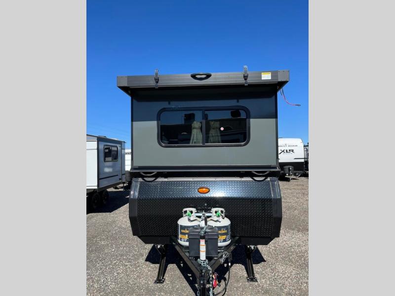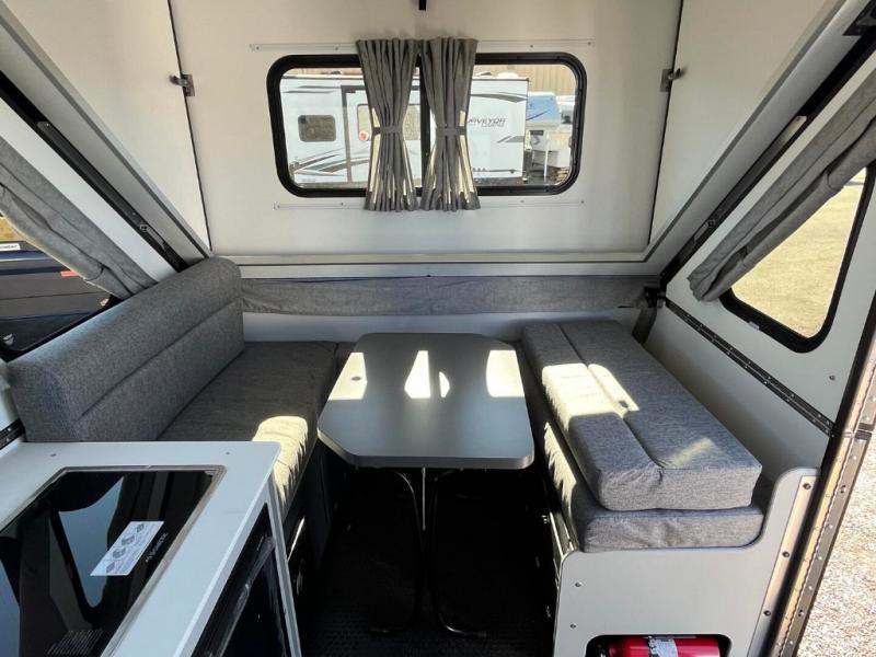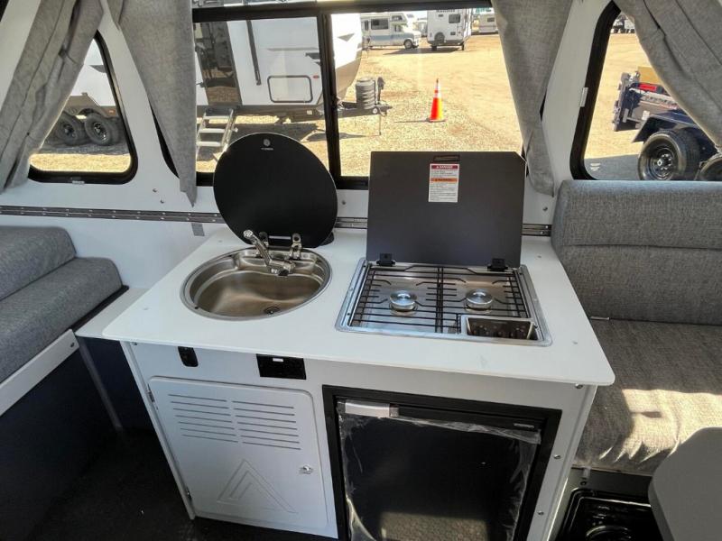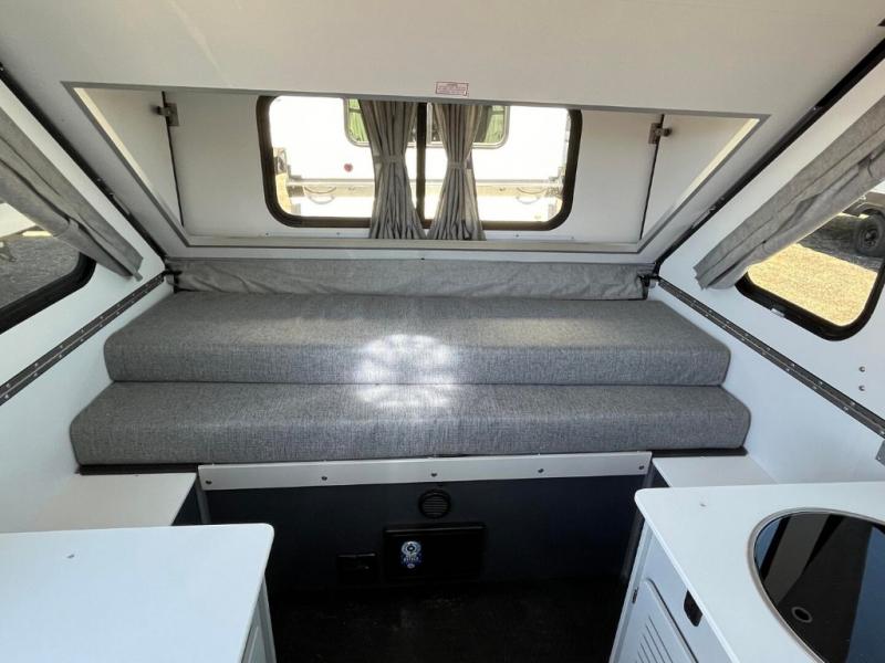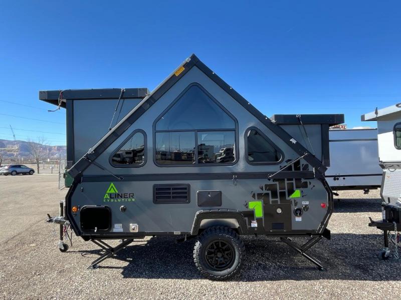 The Evolution A-frame camper by Aliner is coming to you with residential features and solid construction materials. You'll love the slate gray exterior, and the Azdel composite panels included help prolong the life of your camper. There are 15" off-road tires with graphics package, LED running lights, exterior baggage doors, plus many more exterior conveniences. The Evolution A-Frame camper comes with commercial grade, raised coin polyvinyl flooring, SIMONA BOATBOARD interior cabinets and furniture, and three indoor electrical outlets to name a few interior comforts.