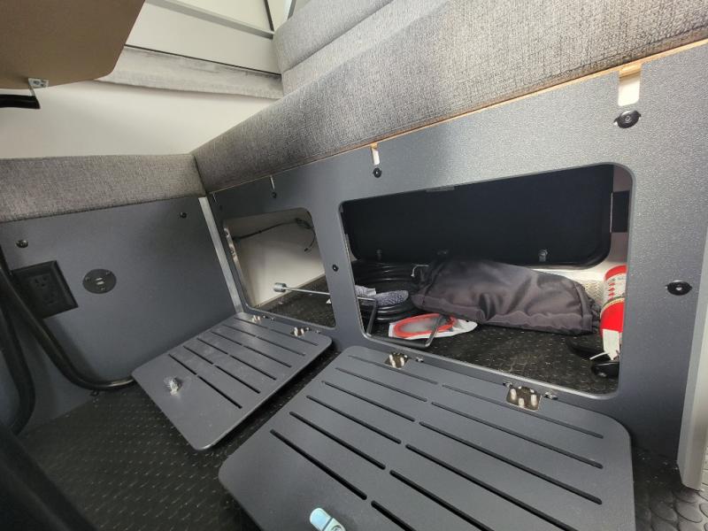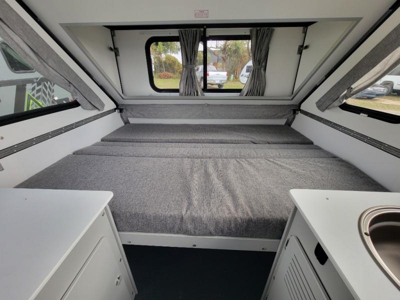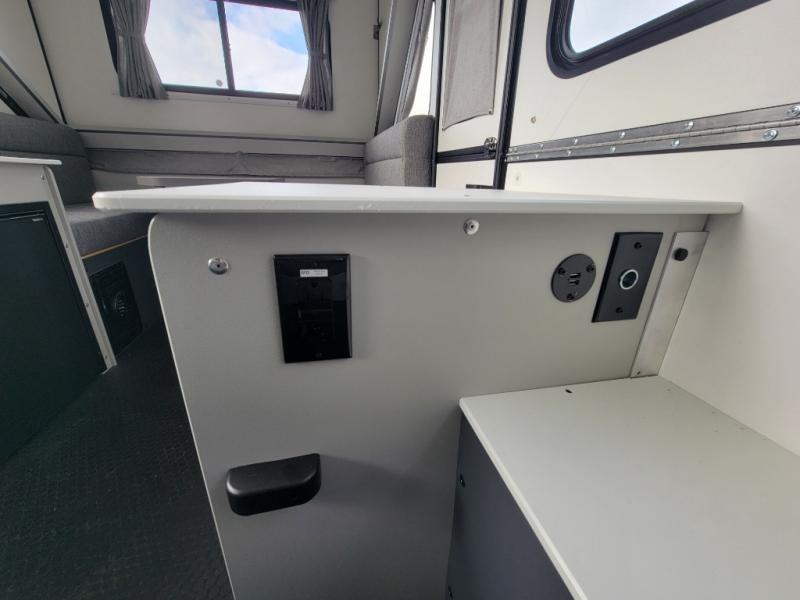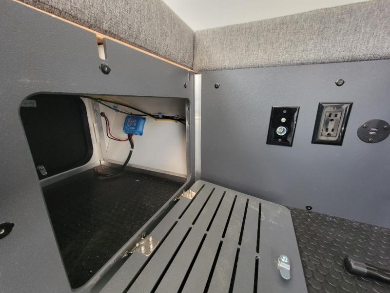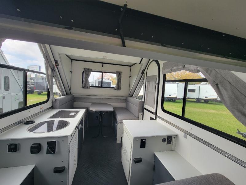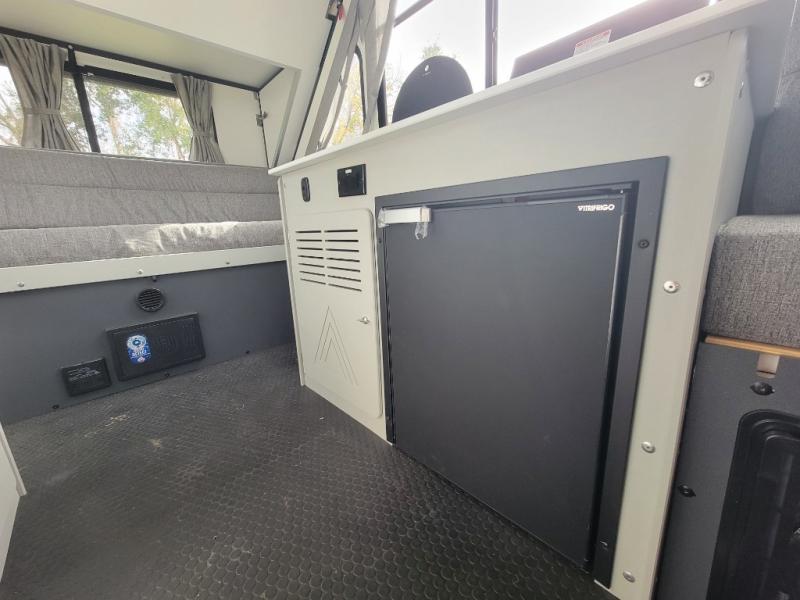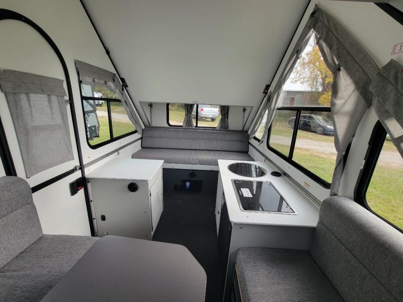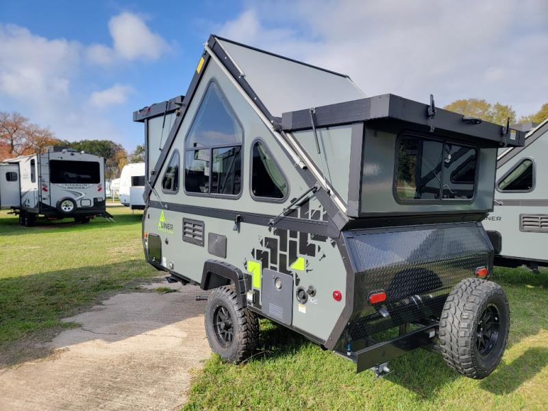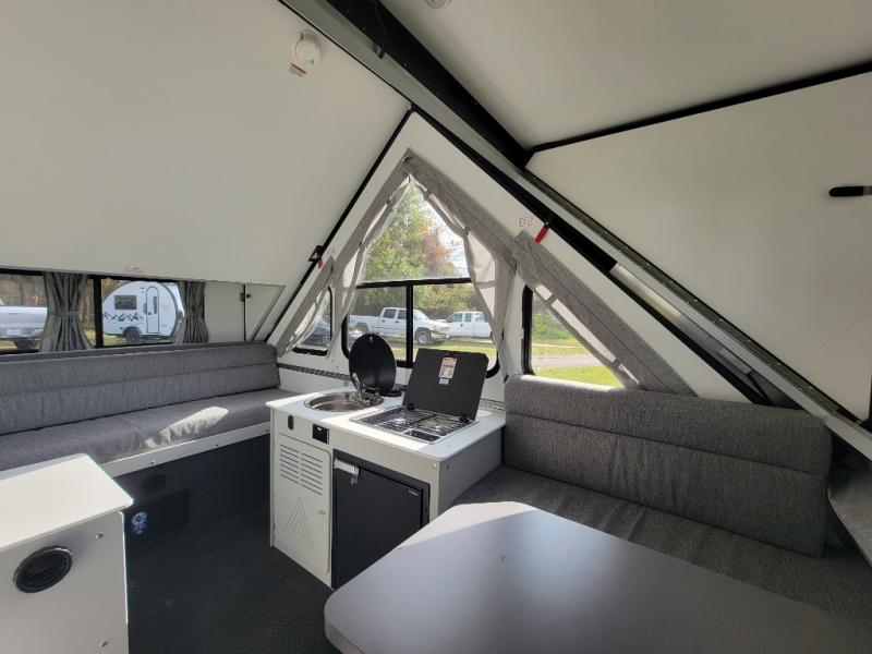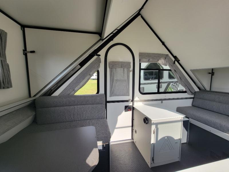The Evolution A-frame camper by Aliner is coming to you with residential features and solid construction materials. You'll love the slate gray exterior, and the Azdel composite panels included help prolong the life of your camper. There are 15" off-road tires with graphics package, LED running lights, exterior baggage doors, plus many more exterior conveniences. The Evolution A-Frame camper comes with commercial grade, raised coin polyvinyl flooring, SIMONA BOATBOARD interior cabinets and furniture, and three indoor electrical outlets to name a few interior comforts.