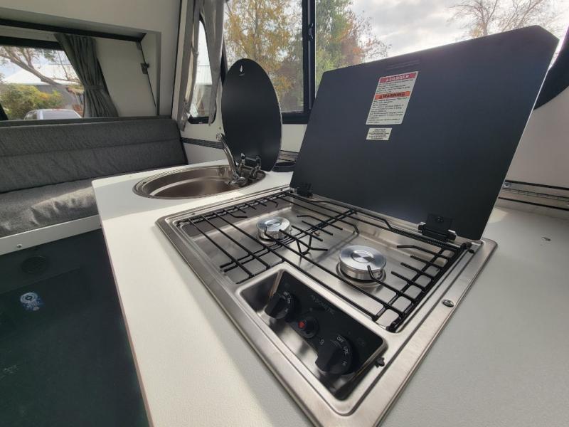 If you're looking for a lightweight camper that can sleep four, take a look at this Evolution 12! There is a sofa bed in the back that will convert to a 56" x 76" bed each night, and the shelves let you store your belongings. The dinette with bed conversion provides a place to dine each day, and a 46" x 76" bed at night. In the morning you can prepare breakfast on the two burner stove, clean up with the flush mount sink, and store cold items in the 3.0 cu. ft. 3-way refrigerator with a freezer. And you can even add an optional outside grill to keep fried food odors outdoors!