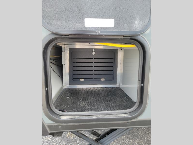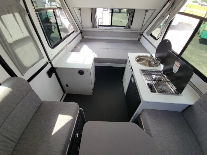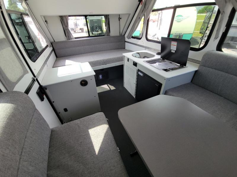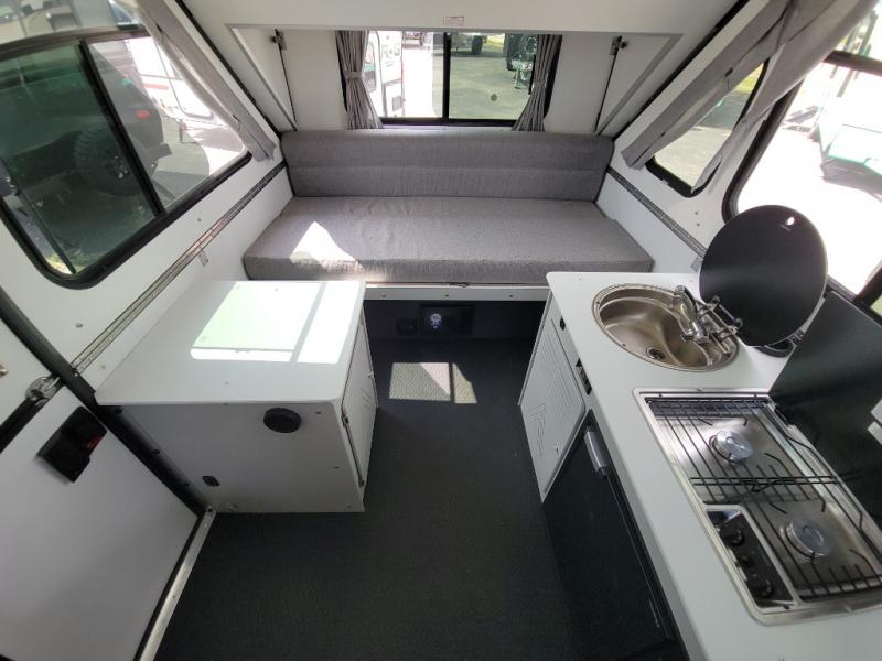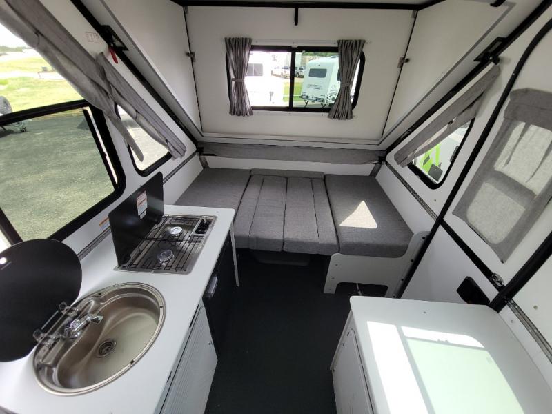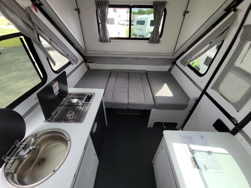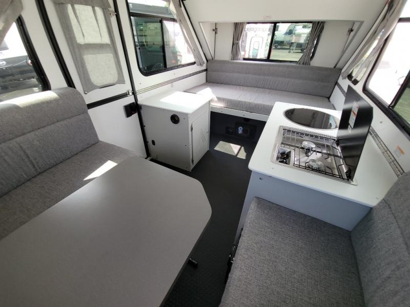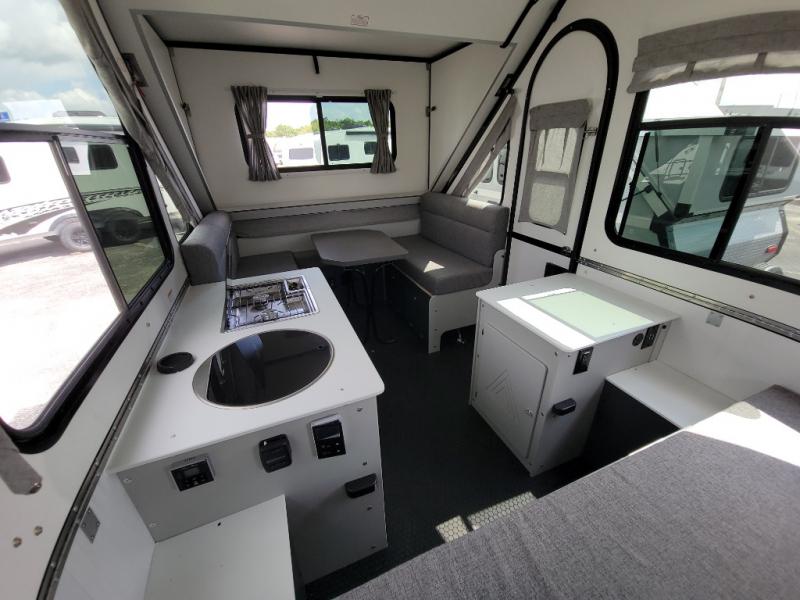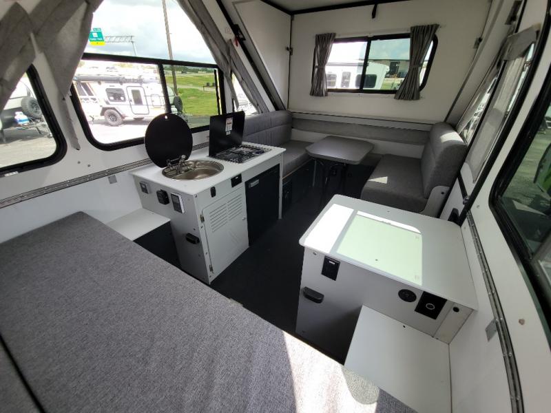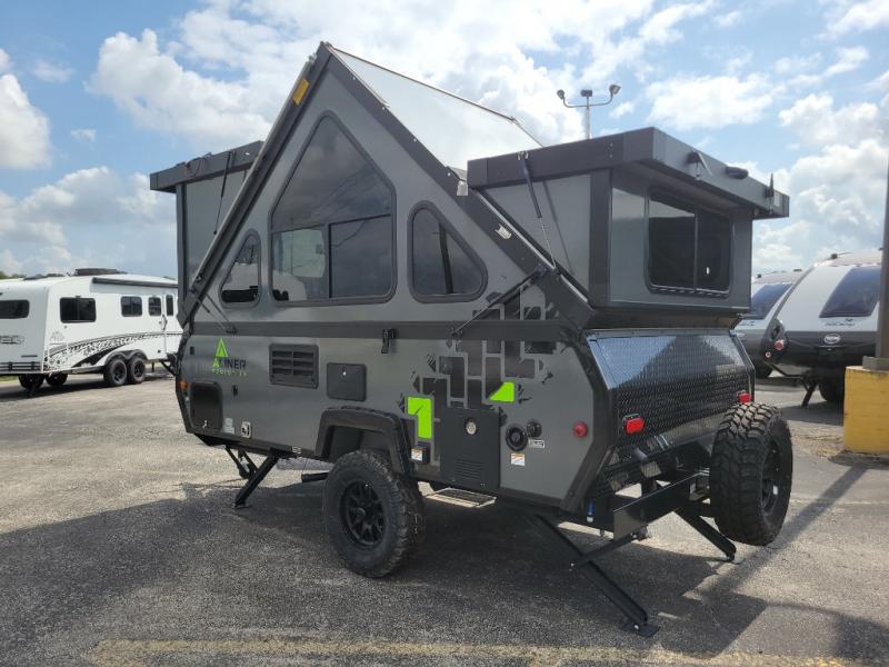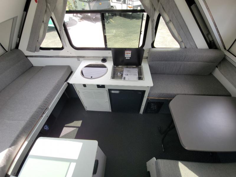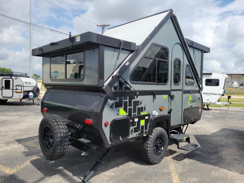 The Evolution A-frame camper by Aliner is coming to you with residential features and solid construction materials. You'll love the slate gray exterior, and the Azdel composite panels included help prolong the life of your camper. There are 15" off-road tires with graphics package, LED running lights, exterior baggage doors, plus many more exterior conveniences. The Evolution A-Frame camper comes with commercial grade, raised coin polyvinyl flooring, SIMONA BOATBOARD interior cabinets and furniture, and three indoor electrical outlets to name a few interior comforts.