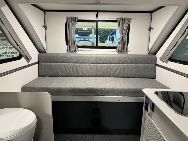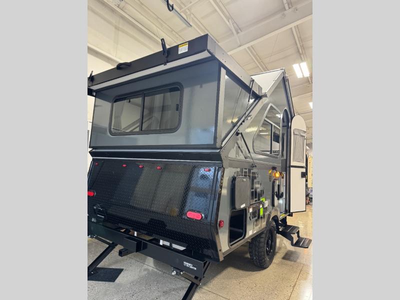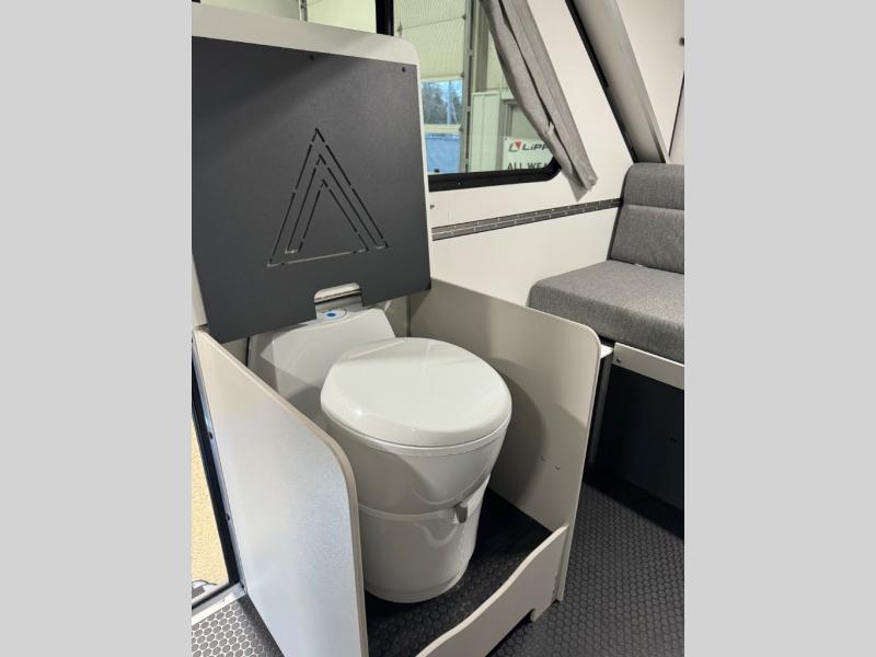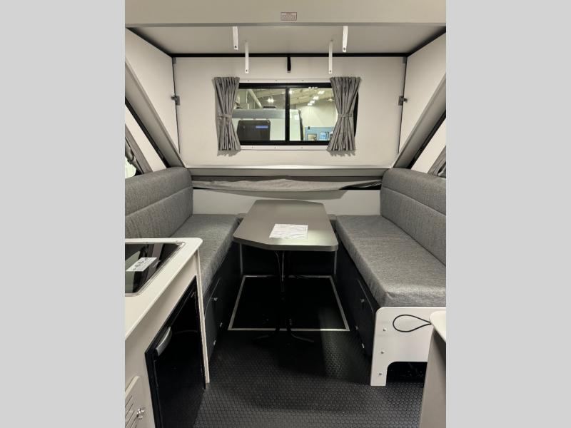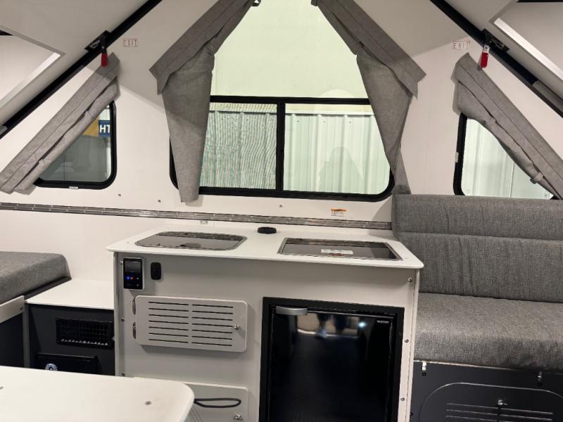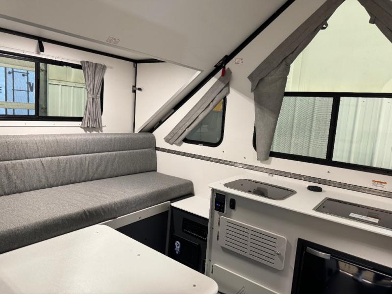 The Evolution A-frame camper by Aliner is coming to you with residential features and solid construction materials. You'll love the slate gray exterior, and the Azdel composite panels included help prolong the life of your camper. There are 15" off-road tires with graphics package, LED running lights, exterior baggage doors, plus many more exterior conveniences. The Evolution A-Frame camper comes with commercial grade, raised coin polyvinyl flooring, SIMONA BOATBOARD interior cabinets and furniture, and three indoor electrical outlets to name a few interior comforts.