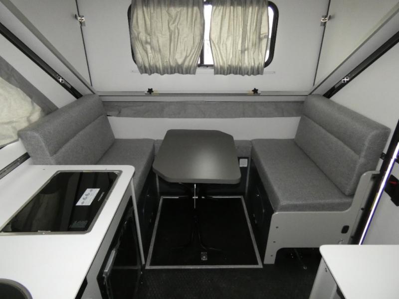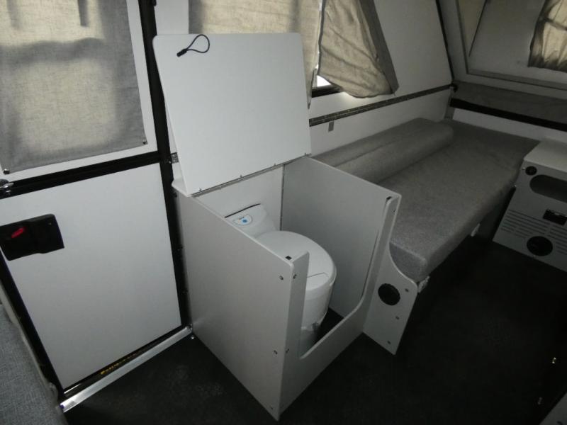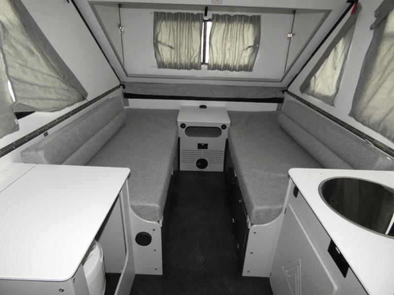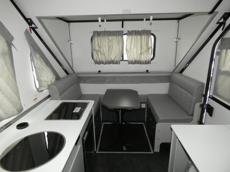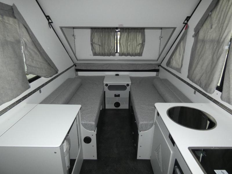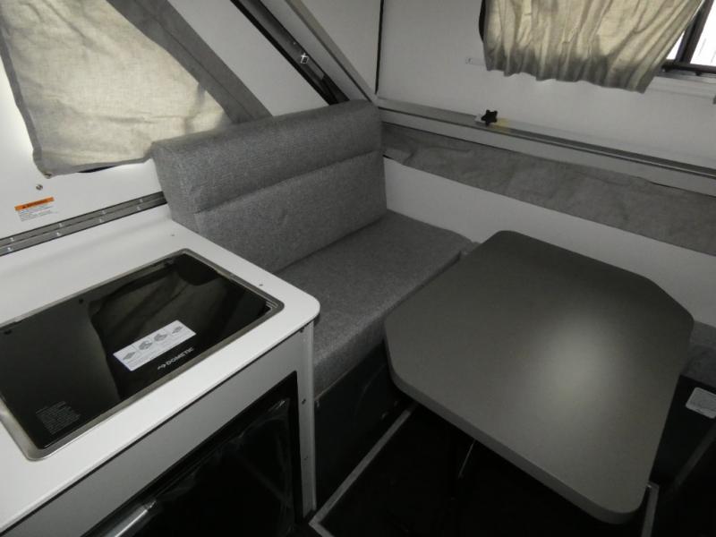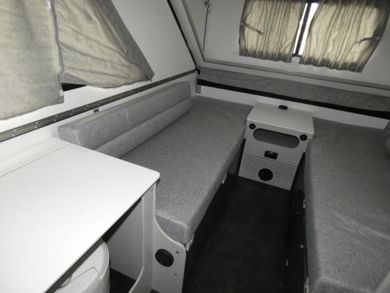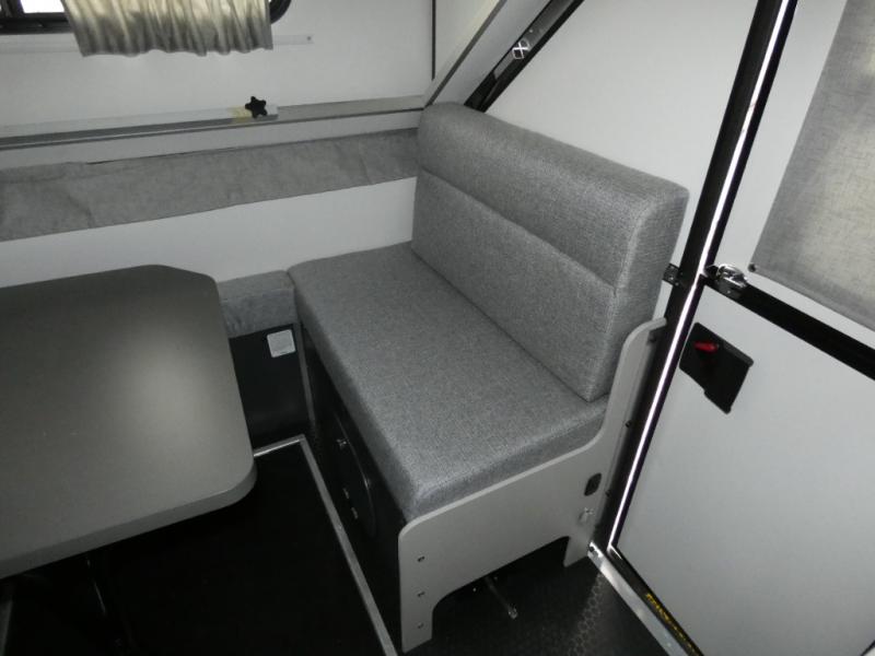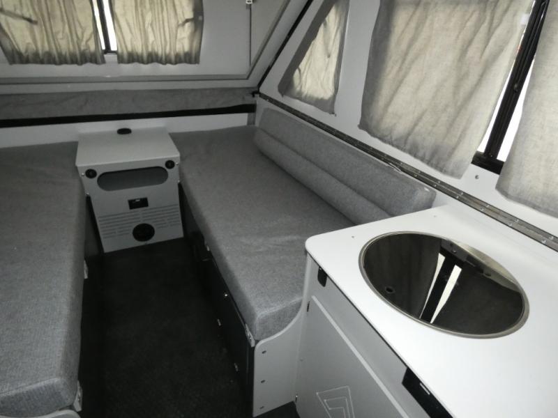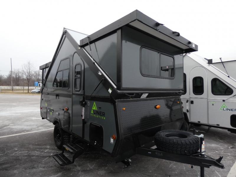 The Evolution A-frame camper by Aliner is coming to you with residential features and solid construction materials. You'll love the slate gray exterior, and the Azdel composite panels included help prolong the life of your camper. There are 15" off-road tires with graphics package, LED running lights, exterior baggage doors, plus many more exterior conveniences. The Evolution A-Frame camper comes with commercial grade, raised coin polyvinyl flooring, SIMONA BOATBOARD interior cabinets and furniture, and three indoor electrical outlets to name a few interior comforts.