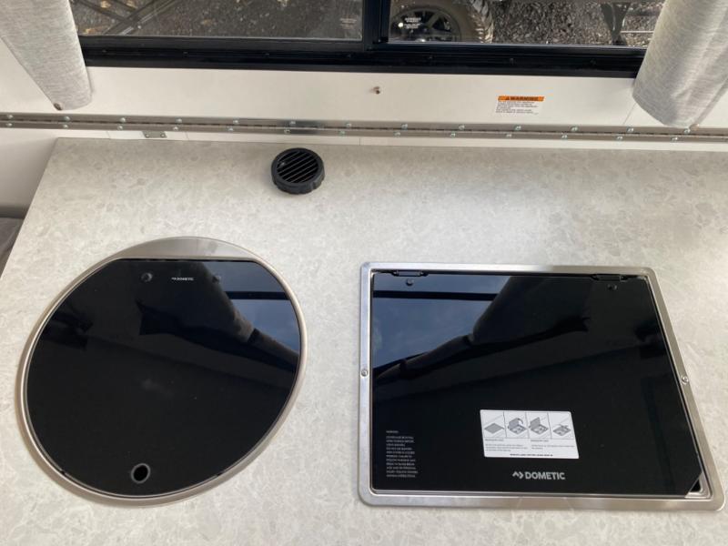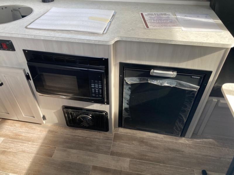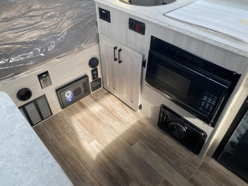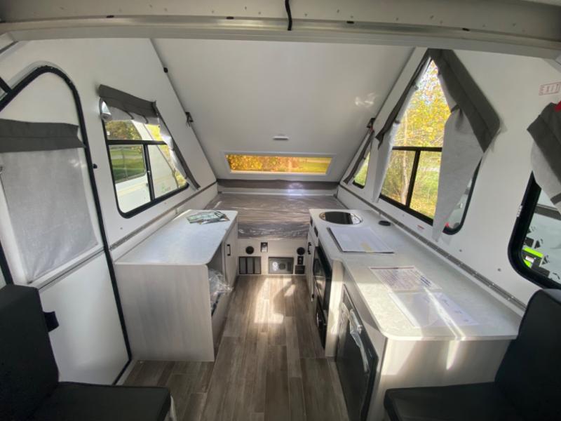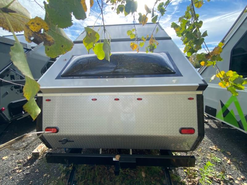 With any Expedition A-frame campers by Aliner, the construction includes a tubular steel frame that is E-coated with a powder coating on the front tongue and bumper, an Azdel lightweight, thermoplastic composite interior wall and ceiling panels, plus Performax 500 premium marine grade flooring for durability. Some extra features include high wind lift assist, additional corner windows with panoramic views, and a command A/C heat pump. Inside, there are high density foam, hypoallergenic cushions, a refrigerator with a freezer, a swivel cassette toilet, and a microwave. You will also appreciate three interior electrical outlets to keep the electronics charged and two skylights with night shades. There are available options to enhance your Expedition such as adding more interior head room with a front or rear hard dormer and/or a rear soft or hard dormer, plus you have the choice to add an outside grill.