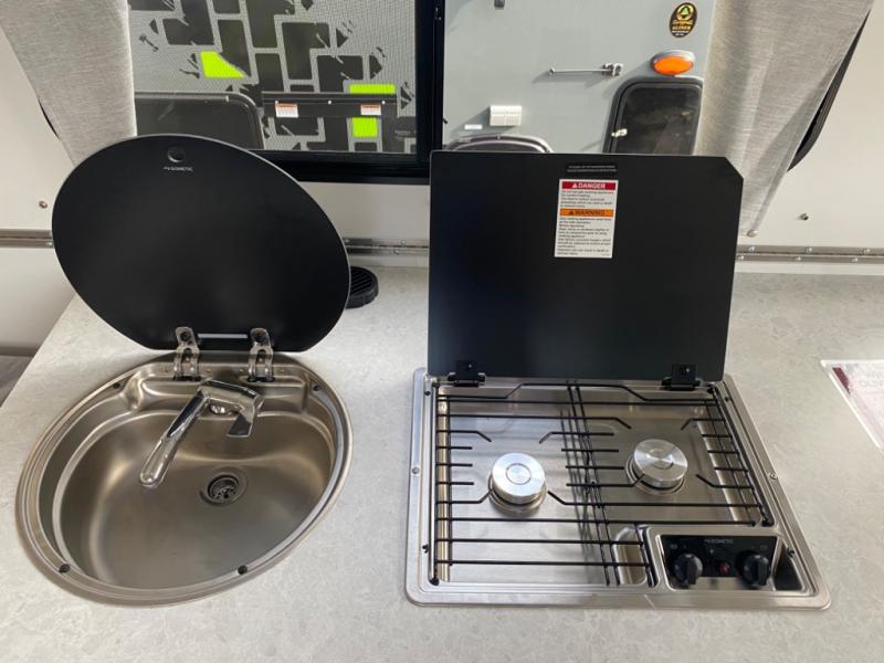 Get ready for comfort, convenience and fun with this Expedition in tow and at the campgrounds! You will have a queen bed to sleep on at night instead of blowing up the air bed! The convertible dinette makes a comfortable 40" x 80" bed for one or two more, plus there is storage under the seats. You will also appreciate having a two burner stove and a microwave to whip up a hot meal and a sink to wash the dishes and brush your teeth. The cassette toilet is also a nice convenience especially at night.