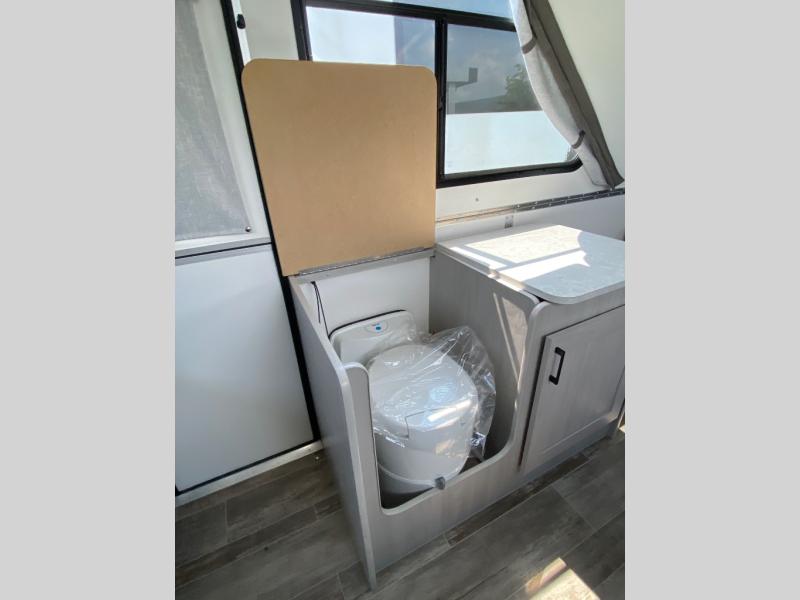 With any Expedition A-frame campers by Aliner, the construction includes a tubular steel frame that is E-coated with a powder coating on the front tongue and bumper, an Azdel lightweight, thermoplastic composite interior wall and ceiling panels, plus Performax 500 premium marine grade flooring for durability. Some extra features include high wind lift assist, additional corner windows with panoramic views, and a command A/C heat pump. Inside, there are high density foam, hypoallergenic cushions, a refrigerator with a freezer, a swivel cassette toilet, and a microwave. You will also appreciate three interior electrical outlets to keep the electronics charged and two skylights with night shades. There are available options to enhance your Expedition such as adding more interior head room with a front or rear hard dormer and/or a rear soft or hard dormer, plus you have the choice to add an outside grill.