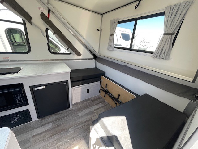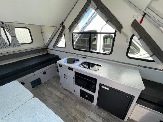 With any Expedition A-frame campers by Aliner, the construction includes a tubular steel frame that is E-coated with a powder coating on the front tongue and bumper, an Azdel lightweight, thermoplastic composite interior wall and ceiling panels, plus Performax 500 premium marine grade flooring for durability. Some extra features include high wind lift assist, additional corner windows with panoramic views, and a command A/C heat pump. Inside, there are high density foam, hypoallergenic cushions, a refrigerator with a freezer, a swivel cassette toilet, and a microwave. You will also appreciate three interior electrical outlets to keep the electronics charged and two skylights with night shades. There are available options to enhance your Expedition such as adding more interior head room with a front or rear hard dormer and/or a rear soft or hard dormer, plus you have the choice to add an outside grill.