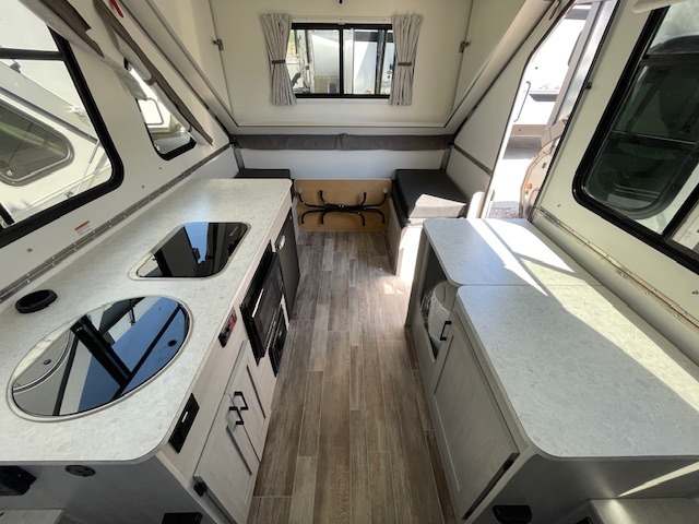 Looking for an indoor place to relax and unwind after exploring outdoors? This Expedition is easy to tow and comfortable to stay in where ever you decide to setup camp. You will have a sofa bed to sit and relax on as well as sleep at night, and there are shelves to place your things like a cellphone and book. The front convertible dinette doubles as a 40" x 80" bed for one or two more, plus there is storage under the seats. You will also appreciate having a two burner stove and a microwave to whip up a hot meal and a sink to wash the dishes and brush your teeth. And the cassette toilet is a nice convenience especially at night.