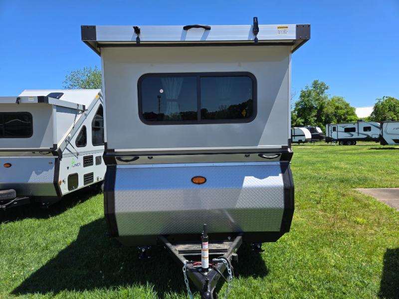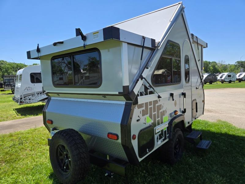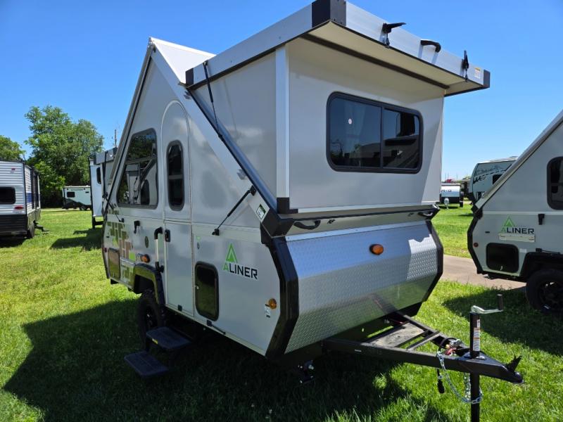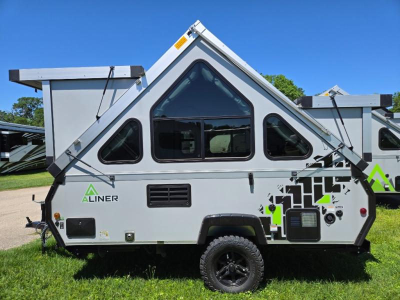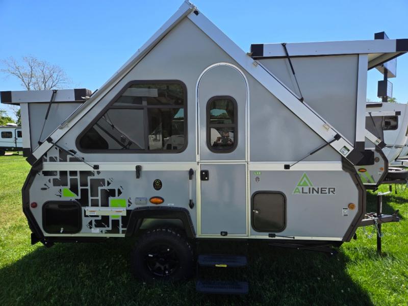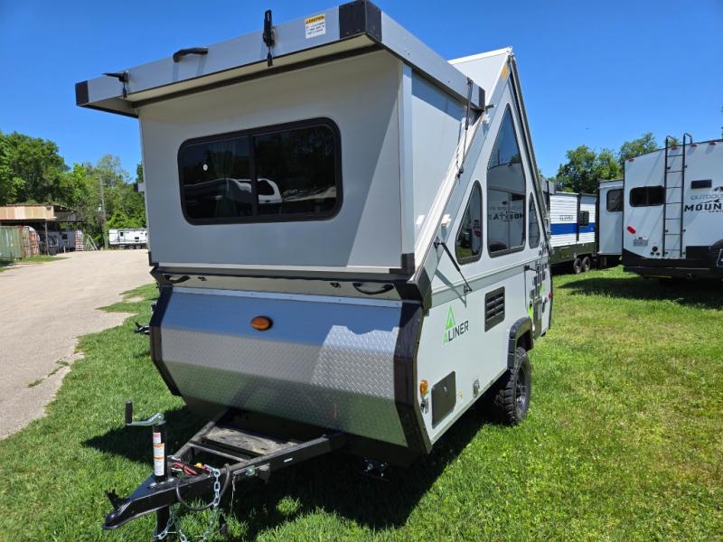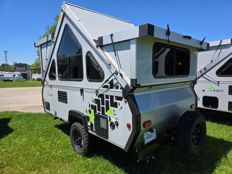 The LXE A-frame camper by Aliner construction includes Azdel lightweight, and vacuum bonded fiberglass panels for durability. Some extra features include an outside shower, LED running lights, additional corner windows, and an A/C heat pump. Inside, there are real hardwood cabinet doors, LED lights, plus three interior electrical outlets to keep the electronics charged. And there are options to enhance your LXE such as adding a front or rear hard dormer, an outside grill and/or the Off Road package.