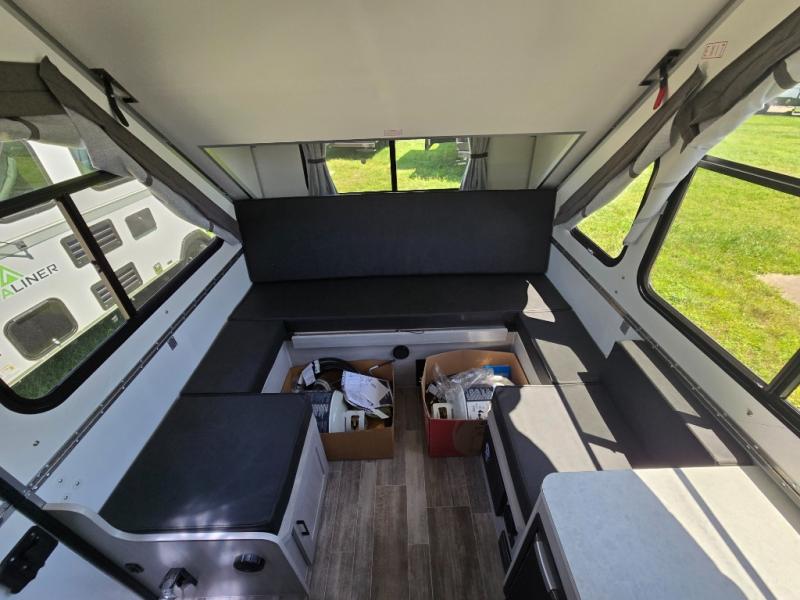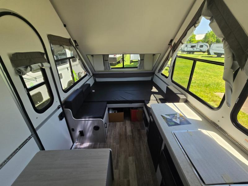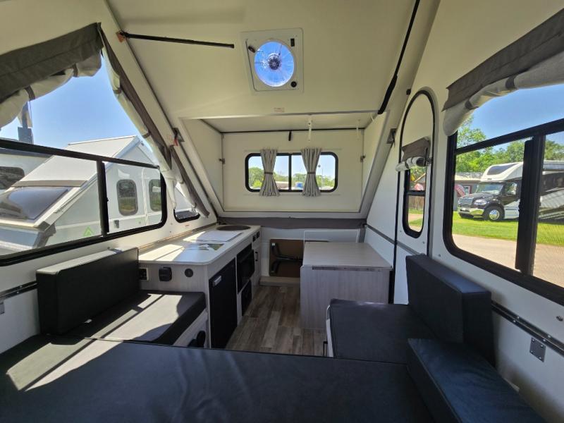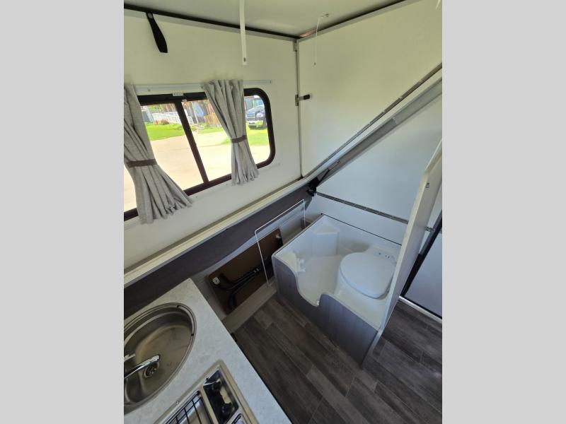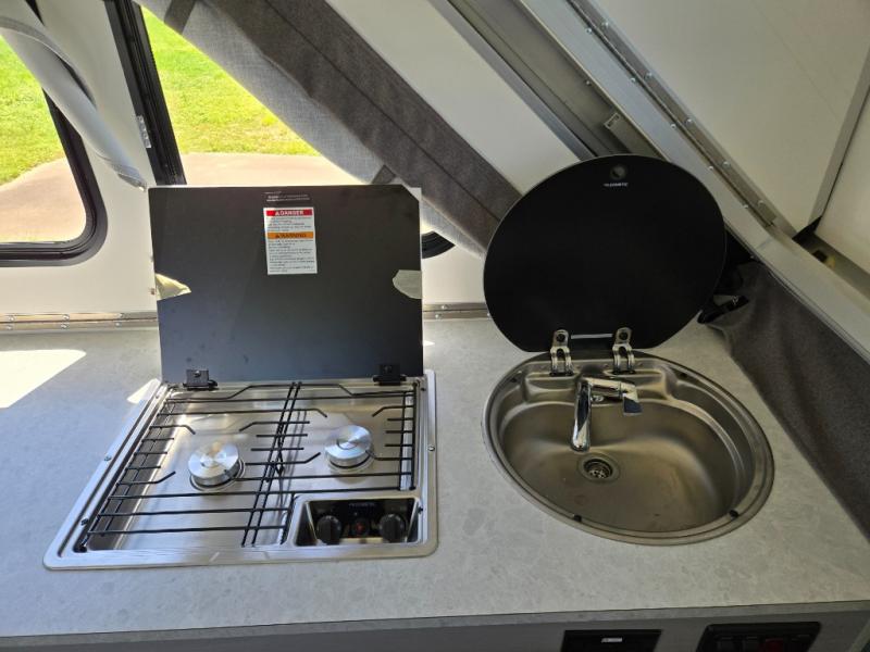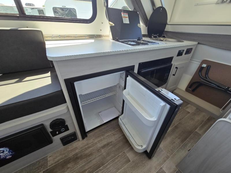 Versatile, comfortable, and convenient indoor living while camping can be found throughout this camper! The built-in shower with a cassette toilet offers convenience and a place to clean up each morning, the 3.0 cu. ft. gas/electric refrigerator offers cold storage, and the microwave plus two burner stove allows you to make warm meals. Eat your meals while sitting on the sofa bed or at the dinette with two seats. And the sofa bed converts into an 80" x 76" bed for a great night's rest!