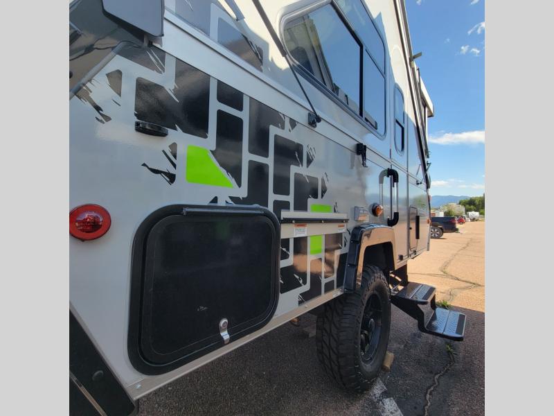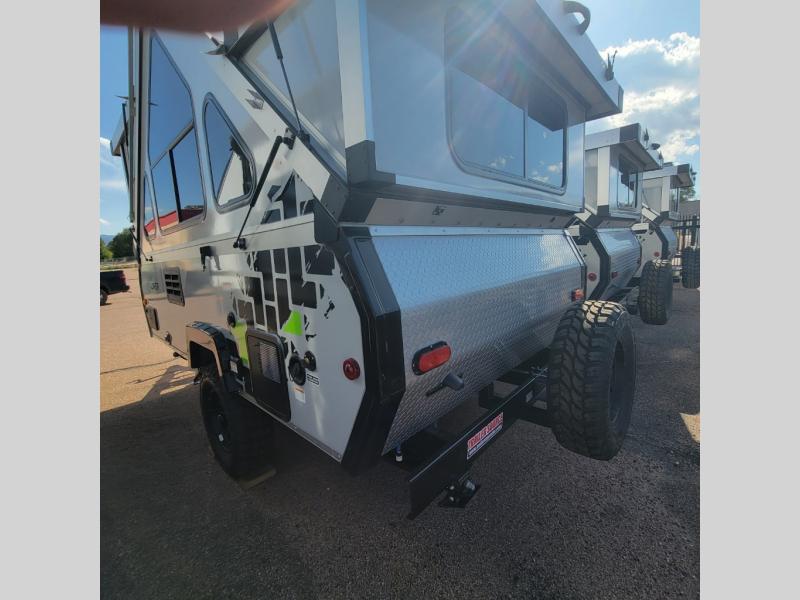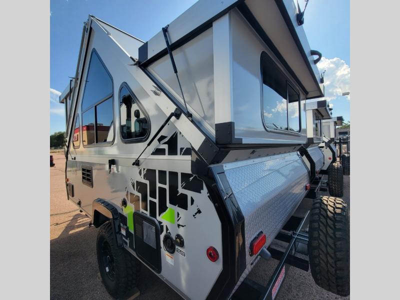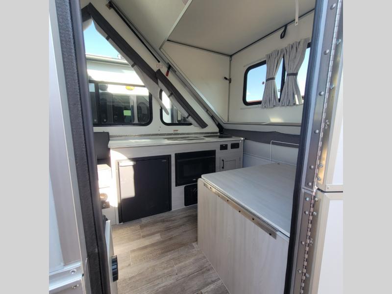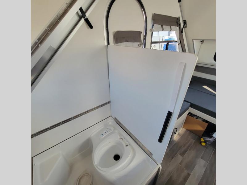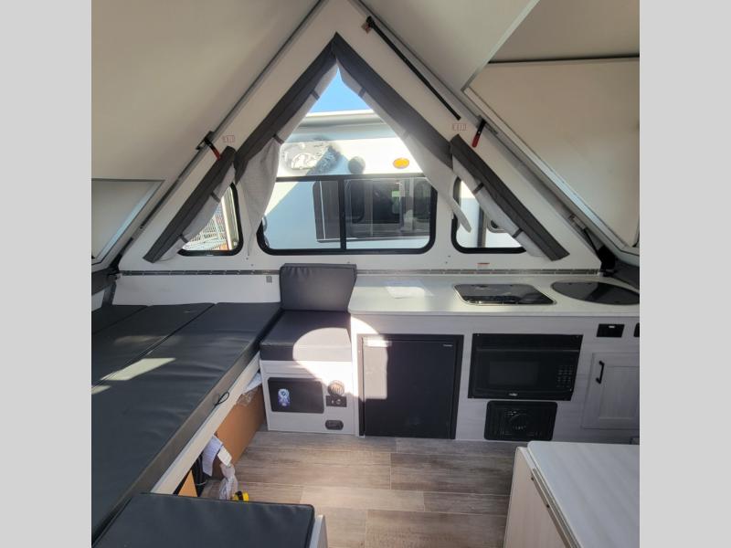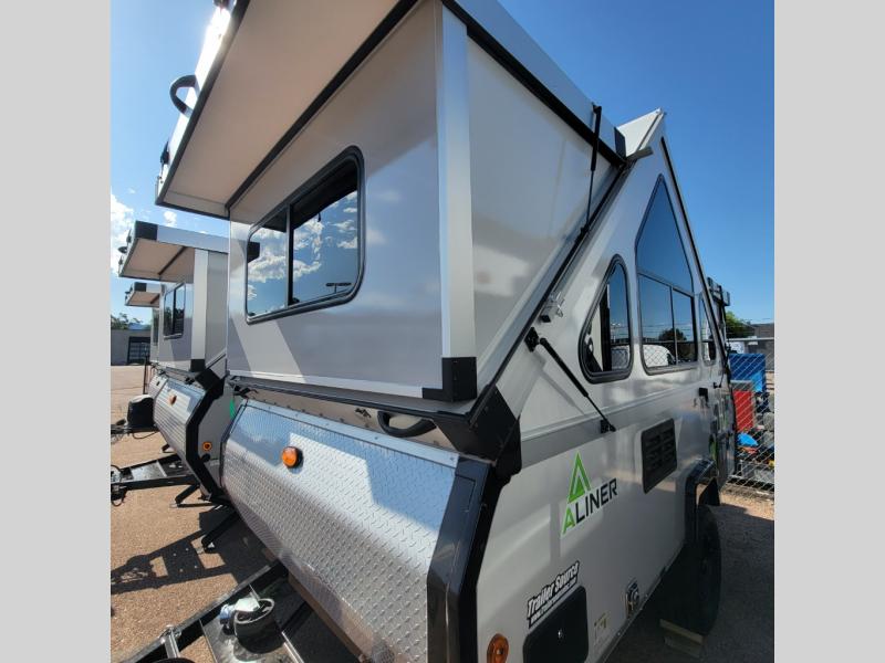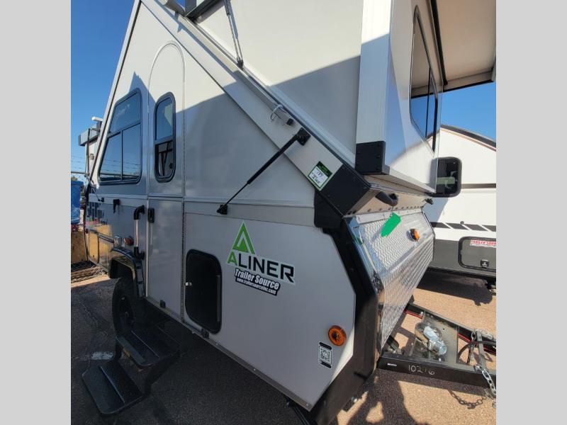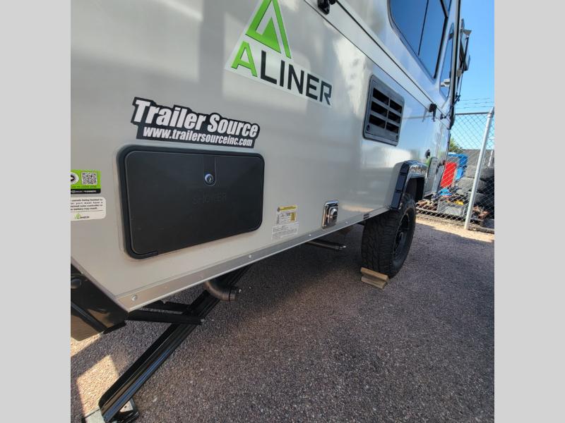 The LXE A-frame camper by Aliner construction includes Azdel lightweight, and vacuum bonded fiberglass panels for durability. Some extra features include an outside shower, LED running lights, additional corner windows, and an A/C heat pump. Inside, there are real hardwood cabinet doors, LED lights, plus three interior electrical outlets to keep the electronics charged. And there are options to enhance your LXE such as adding a front or rear hard dormer, an outside grill and/or the Off Road package.