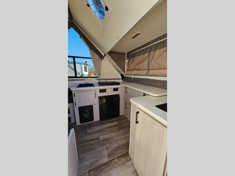 With any Ranger A-frame camper by Aliner, the construction includes Azdel lightweight, composite interior wall and ceiling panels for added durability. Inside, there is high density foam, hypoallergenic cushions and mattress, a 12 Volt refrigerator/freezer, three interior electrical outlets, and LED lights to keep your space well lit. There are also options to enhance your Ranger such as adding a front soft dormer, high wind lift assist, an Off-Road Package, and more depending which Ranger you choose.