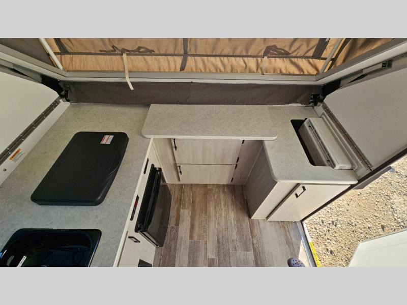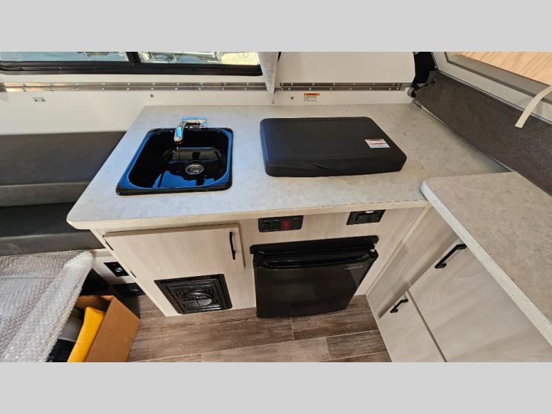 When you only need sleeping space for one or two, enjoy making last minute plans, and prefer your everyday vehicle to do your towing, this camper makes sense! The front kitchen makes it easy to walk around as you prepare meals using the two burner stove and sink, and there is more counterspace plus extra storage near the entry, and there is a refrigerator/freezer. The rear dinette converts into a 56" x 76" bed and also has storage under the seats for blankets, outdoor gear and such.