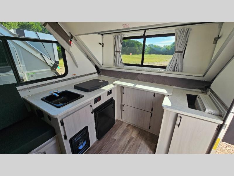 With any Ranger A-frame camper by Aliner, the construction includes Azdel lightweight, composite interior wall and ceiling panels for added durability. Inside, there is high density foam, hypoallergenic cushions and mattress, a 12 Volt refrigerator/freezer, three interior electrical outlets, and LED lights to keep your space well lit. There are also options to enhance your Ranger such as adding a front soft dormer, high wind lift assist, an Off-Road Package, and more depending which Ranger you choose.