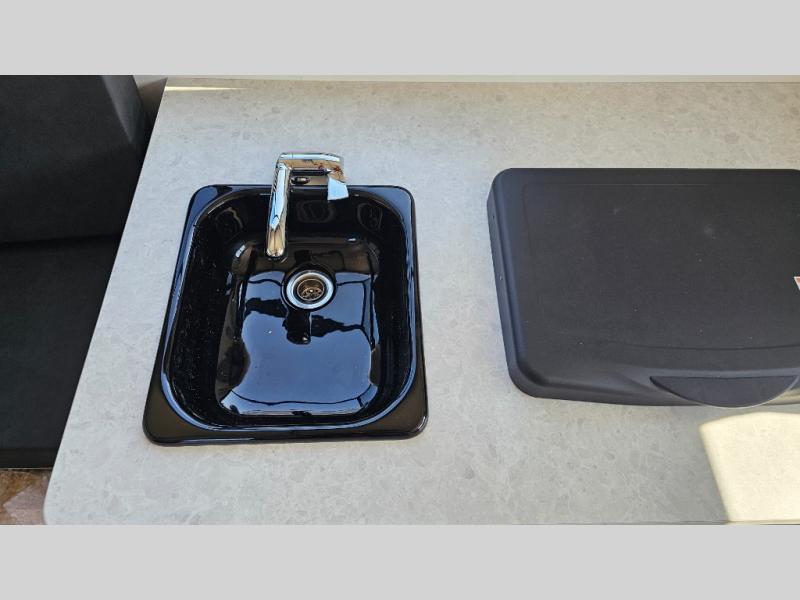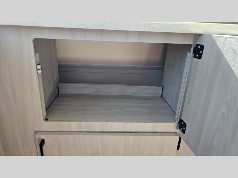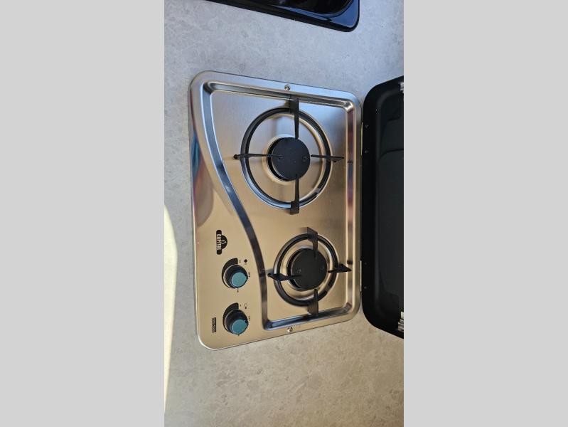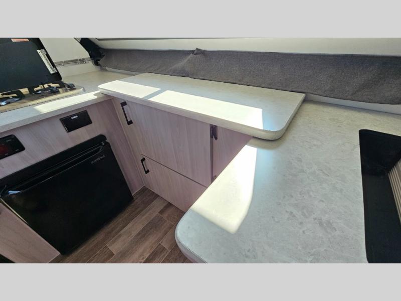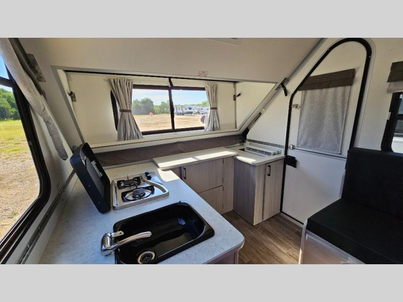 When you only need sleeping space for one or two, enjoy making last minute plans, and prefer your everyday vehicle to do your towing, this camper makes sense! The front kitchen makes it easy to walk around as you prepare meals using the two burner stove and sink, and there is more counterspace plus extra storage near the entry, and there is a refrigerator/freezer. The rear dinette converts into a 56" x 76" bed and also has storage under the seats for blankets, outdoor gear and such.