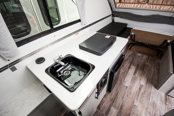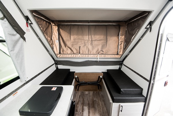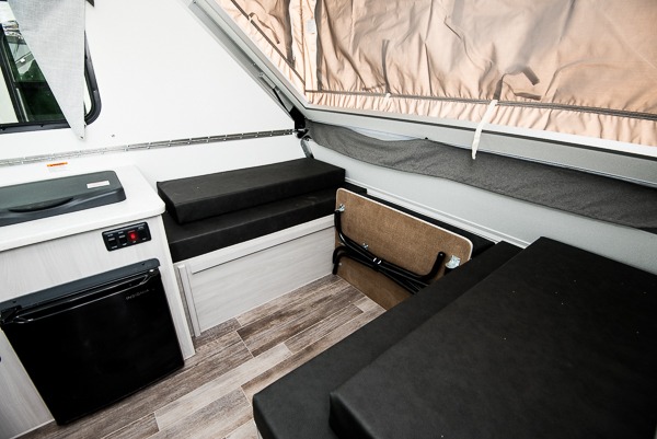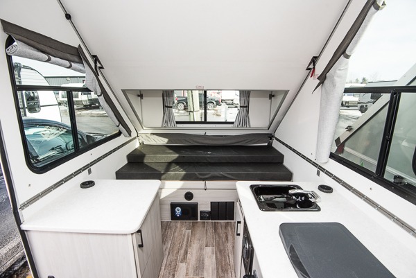 Looking for a camper that you can relax and unwind inside when you aren't exploring outdoors? Need sleeping space for two or three? Well the rear sofa bed in this camper converts into a 56" x 76" bed and the front dinette converts into a 46" x 76" bed. You will find storage space under the dinette seats, shelves on either side of the sofa, and a storage area across from the kitchen. You can prepare delicious meals with the two burner stove, clean up with the sink, and keep your perishables fresh within the refrigerator/freezer underneath the stove and sink. You might even like to add an optional soft or hard dormer to the front or rear of this unit, and/or the optional Off Road package.