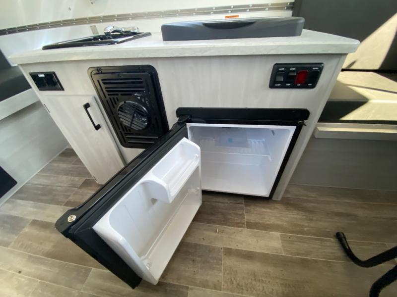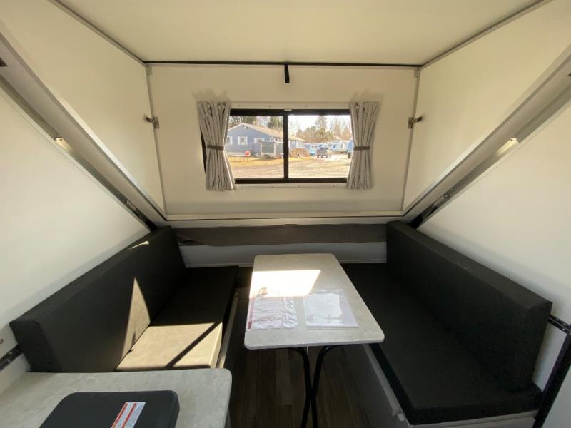 Looking for a camper that you can relax and unwind inside when you aren't exploring outdoors? Need sleeping space for two or three? Well the rear sofa bed in this camper converts into a 56" x 76" bed and the front dinette converts into a 46" x 76" bed. You will find storage space under the dinette seats, shelves on either side of the sofa, and a storage area across from the kitchen. You can prepare delicious meals with the two burner stove, clean up with the sink, and keep your perishables fresh within the refrigerator/freezer underneath the stove and sink. You might even like to add an optional soft or hard dormer to the front or rear of this unit, and/or the optional Off Road package.