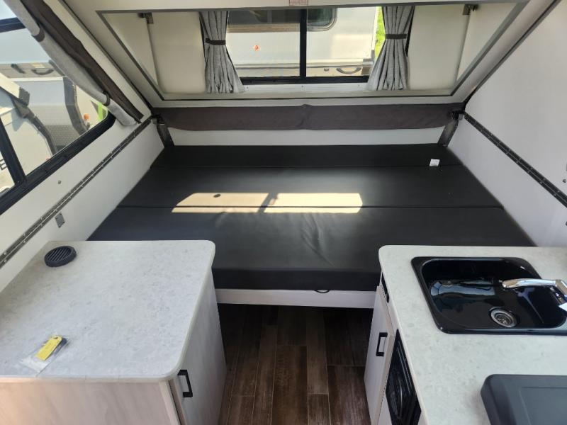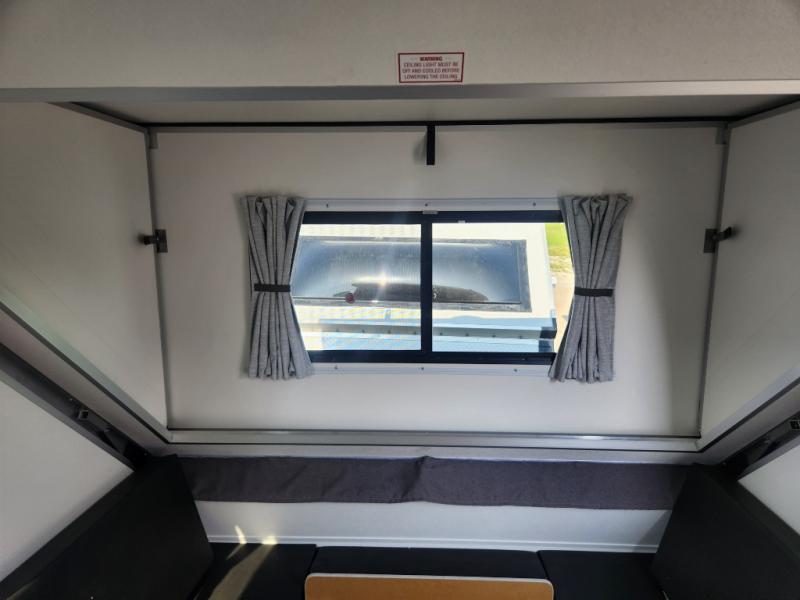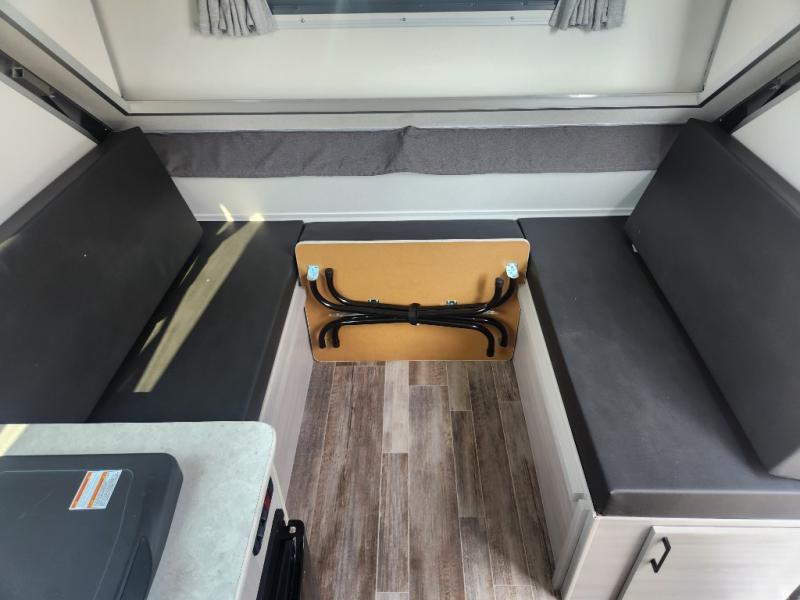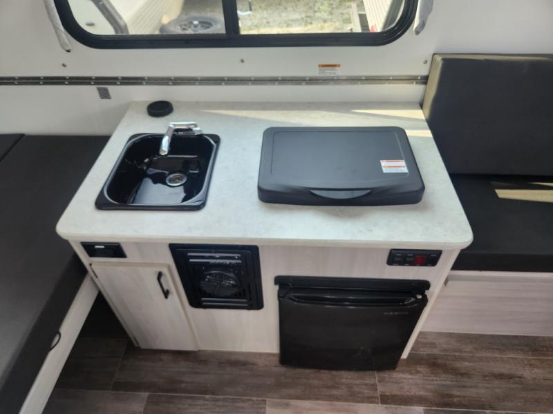 Looking for a camper that you can relax and unwind inside when you aren't exploring outdoors? Need sleeping space for two or three? Well the rear sofa bed in this camper converts into a 56" x 76" bed and the front dinette converts into a 46" x 76" bed. You will find storage space under the dinette seats, shelves on either side of the sofa, and a storage area across from the kitchen. You can prepare delicious meals with the two burner stove, clean up with the sink, and keep your perishables fresh within the refrigerator/freezer underneath the stove and sink. You might even like to add an optional soft or hard dormer to the front or rear of this unit, and/or the optional Off Road package.