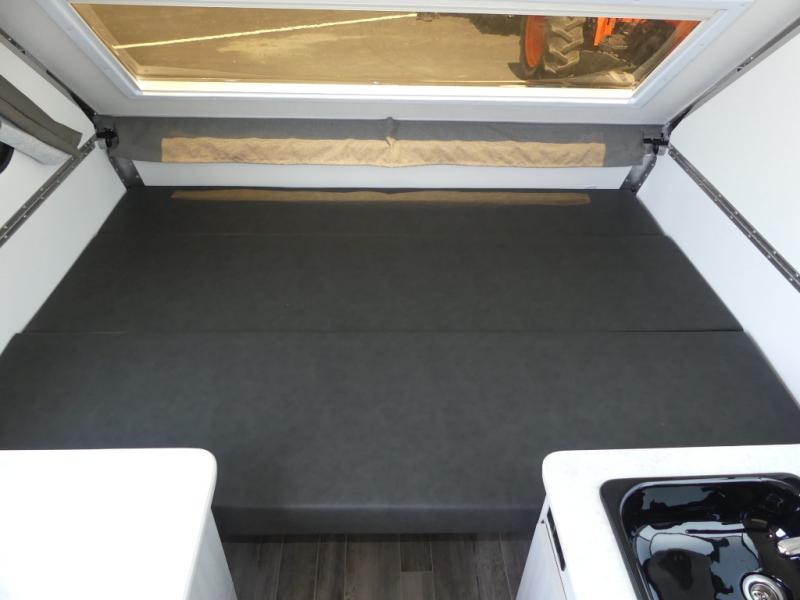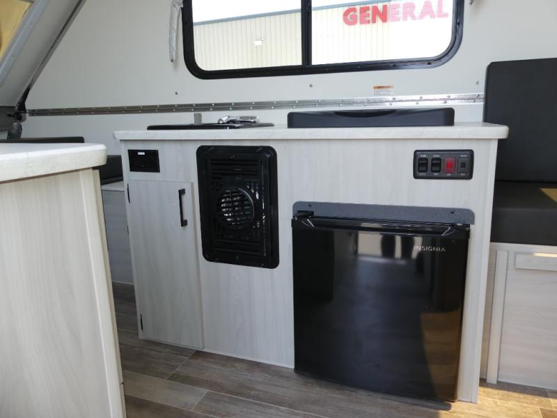 With any Ranger A-frame camper by Aliner, the construction includes Azdel lightweight, composite interior wall and ceiling panels for added durability. Inside, there is high density foam, hypoallergenic cushions and mattress, a 12 Volt refrigerator/freezer, three interior electrical outlets, and LED lights to keep your space well lit.