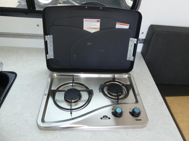Looking for a camper that you can relax and unwind inside when you aren't exploring outdoors? Need sleeping space for two or three? Well the rear sofa bed in this camper converts into a 56" x 76" bed and the front dinette converts into a 46" x 76" bed. You will find storage space under the dinette seats, shelves on either side of the sofa, and a storage area across from the kitchen. You can prepare delicious meals with the two burner stove, clean up with the sink, and keep your perishables fresh within the refrigerator/freezer underneath the stove and sink.