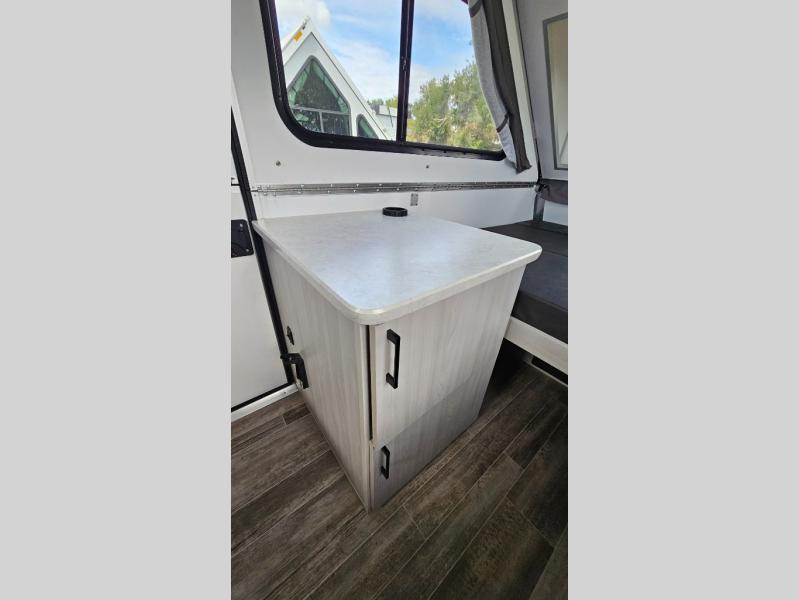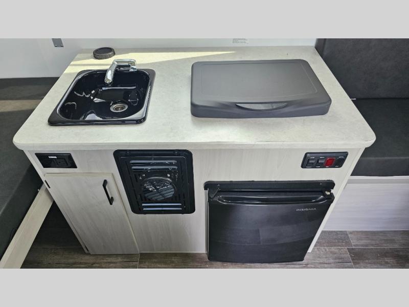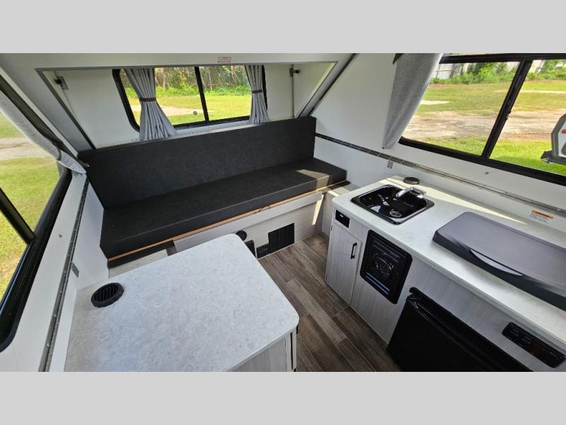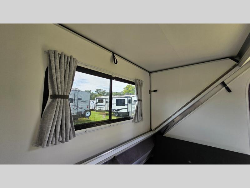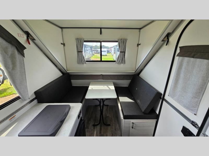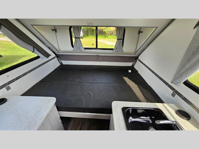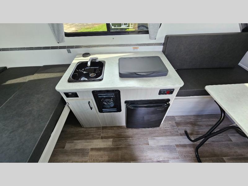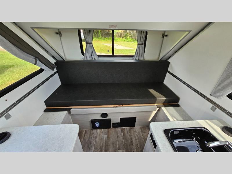 Looking for a camper that you can relax and unwind inside when you aren't exploring outdoors? Need sleeping space for two or three? Well the rear sofa bed in this camper converts into a 56" x 76" bed and the front dinette converts into a 46" x 76" bed. You will find storage space under the dinette seats, shelves on either side of the sofa, and a storage area across from the kitchen. You can prepare delicious meals with the two burner stove, clean up with the sink, and keep your perishables fresh within the refrigerator/freezer underneath the stove and sink. You might even like to add an optional soft or hard dormer to the front or rear of this unit, and/or the optional Off Road package.
