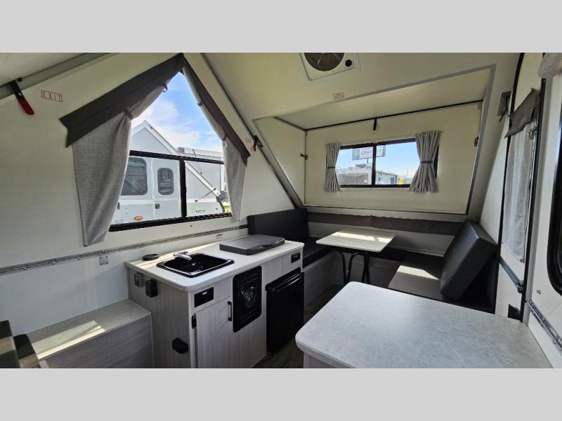 With any Ranger A-frame camper by Aliner, the construction includes Azdel lightweight, composite interior wall and ceiling panels for added durability. Inside, there is high density foam, hypoallergenic cushions and mattress, a 12 Volt refrigerator/freezer, three interior electrical outlets, and LED lights to keep your space well lit. There are also options to enhance your Ranger such as adding a front soft dormer, high wind lift assist, an Off-Road Package, and more depending which Ranger you choose.
