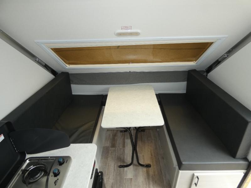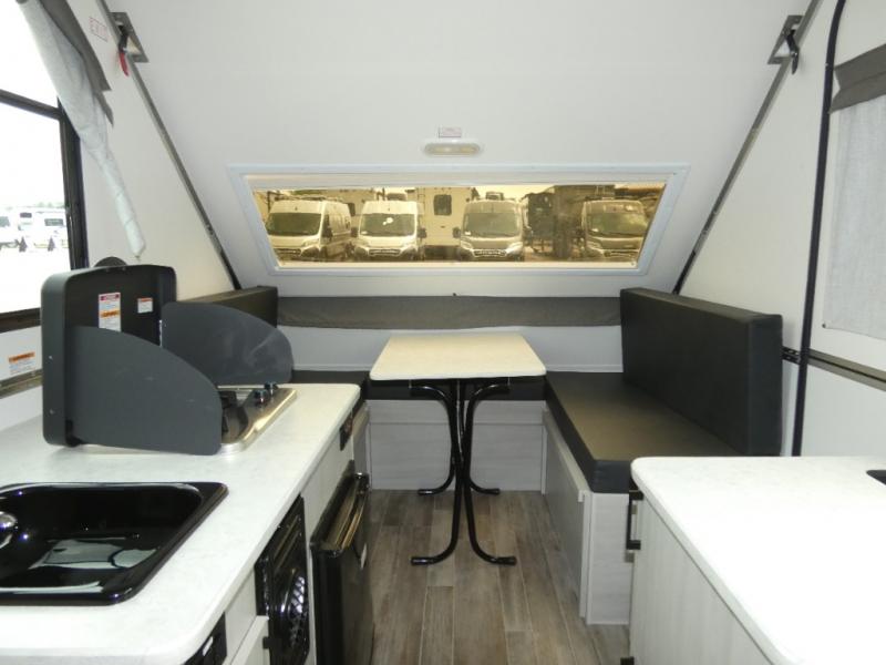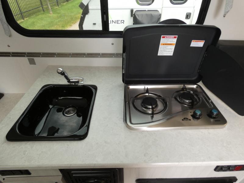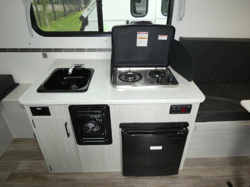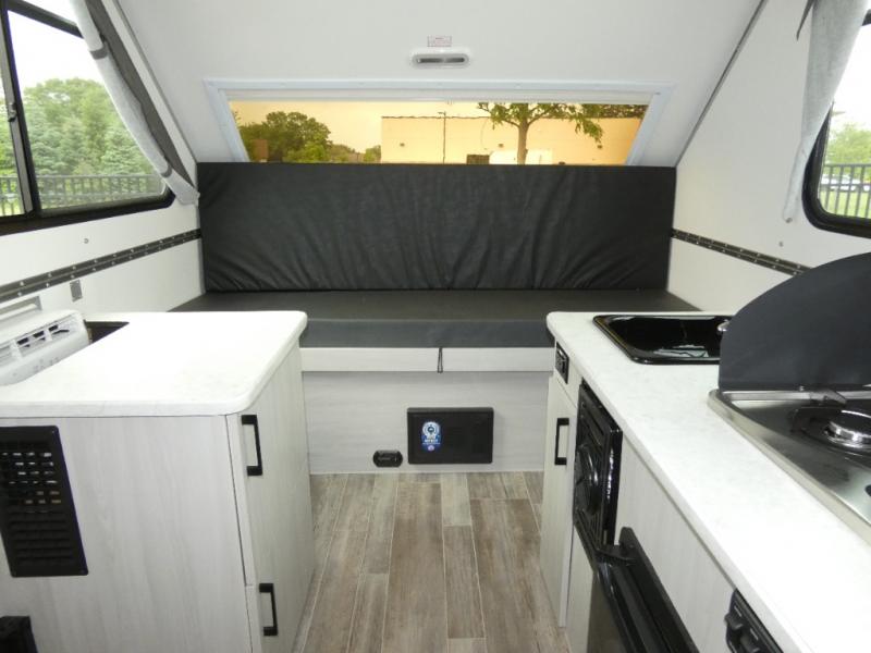 Looking for a camper that you can relax and unwind inside when you aren't exploring outdoors? Need sleeping space for two or three? Well the rear sofa bed in this camper converts into a 56" x 76" bed and the front dinette converts into a 46" x 76" bed. You will find storage space under the dinette seats, shelves on either side of the sofa, and a storage area across from the kitchen. You can prepare delicious meals with the two burner stove, clean up with the sink, and keep your perishables fresh within the refrigerator/freezer underneath the stove and sink.