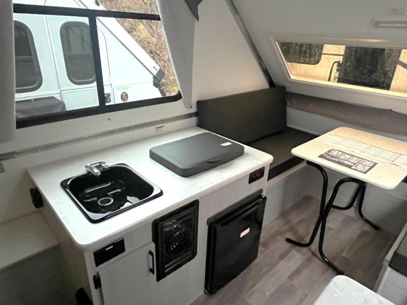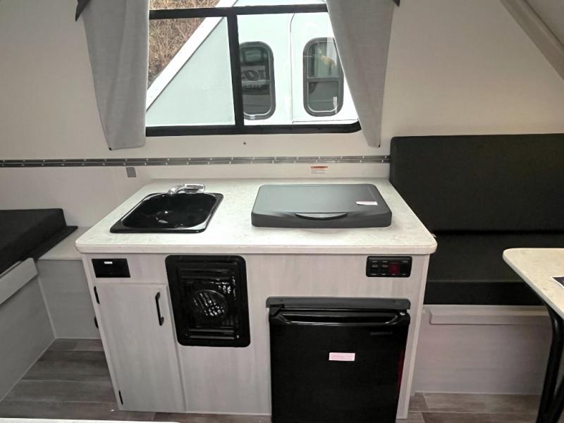 With any Ranger A-frame camper by Aliner, the construction includes Azdel lightweight, composite interior wall and ceiling panels for added durability. Inside, there is high density foam, hypoallergenic cushions and mattress, a 12 Volt refrigerator/freezer, three interior electrical outlets, and LED lights to keep your space well lit. There are also options to enhance your Ranger such as adding a front soft dormer, high wind lift assist, an Off-Road Package, and more depending which Ranger you choose.