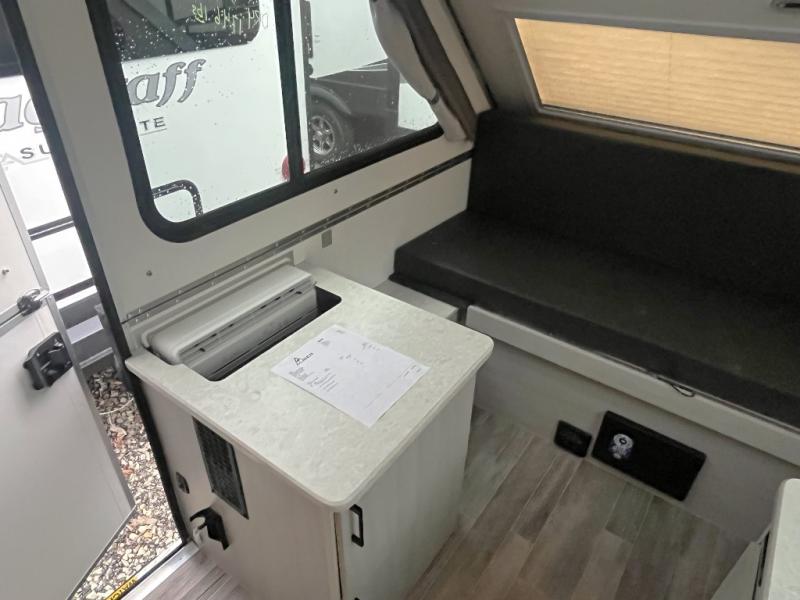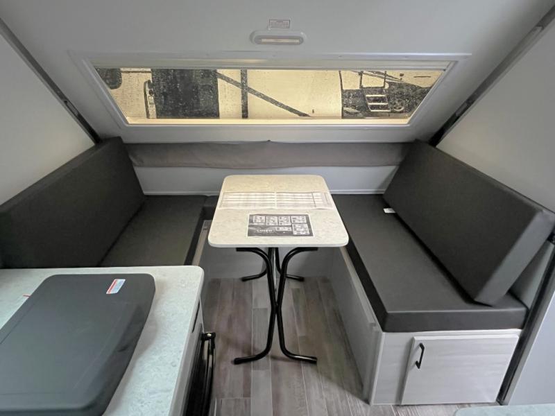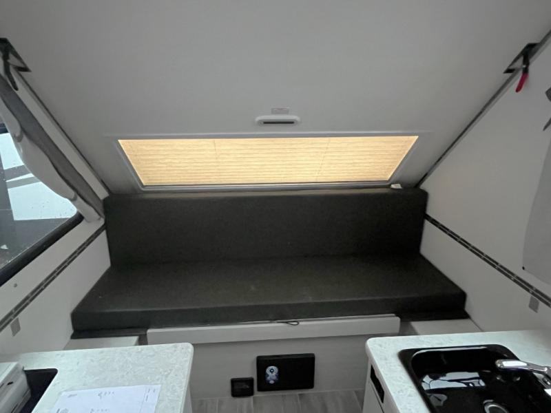 Looking for a camper that you can relax and unwind inside when you aren't exploring outdoors? Need sleeping space for two or three? Well the rear sofa bed in this camper converts into a 56" x 76" bed and the front dinette converts into a 46" x 76" bed. You will find storage space under the dinette seats, shelves on either side of the sofa, and a storage area across from the kitchen. You can prepare delicious meals with the two burner stove, clean up with the sink, and keep your perishables fresh within the refrigerator/freezer underneath the stove and sink. You might even like to add an optional soft or hard dormer to the front or rear of this unit, and/or the optional Off Road package.