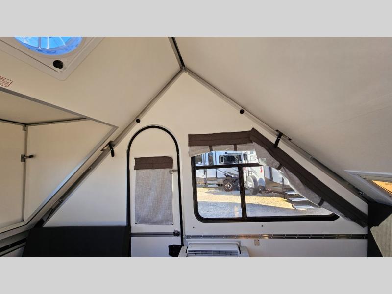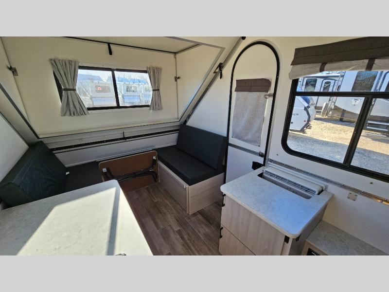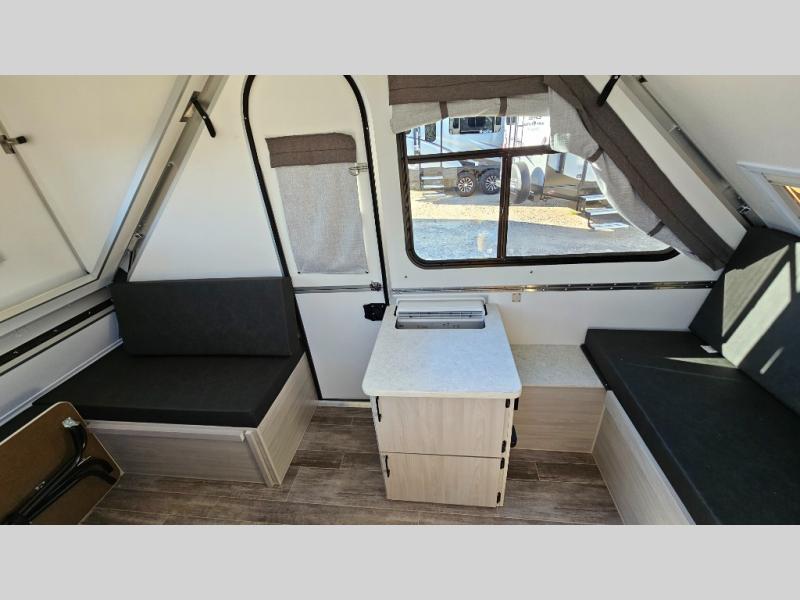Get ready to sleep above ground as you upgrade from tent camping to this A-frame camper! It is easy to tow, set up and store when the fun is over. Inside you will find ample storage for your gear, a dinette to dine at when you aren't outside, a sofa bed to relax on before bedtime, and both furnishings covert to sleeping space. The dinette converts to a 46" x 76" bed, and there is storage under the seats. You will also have shelves to set your phone and such on. There are more features such as three electrical outlets inside, one outlet outside, high density foam, hypoallergenic cushions and mattress, a fantastic vent-fan, and options to choose from such as a front soft dormer, a rear soft dormer, and/or an Extreme Off-Road package, plus more!