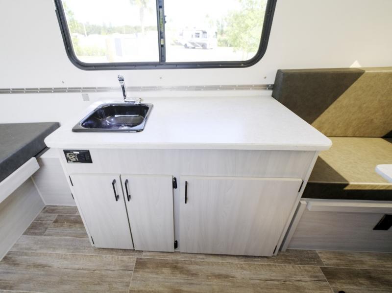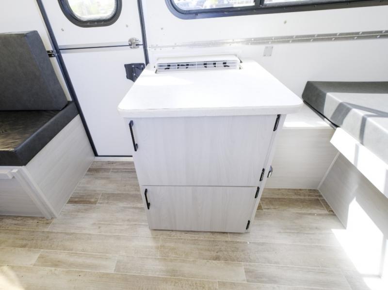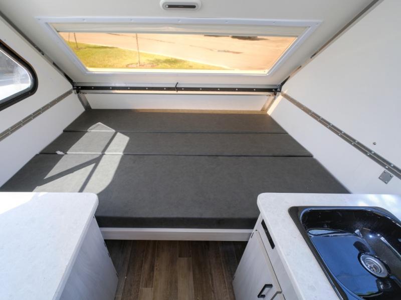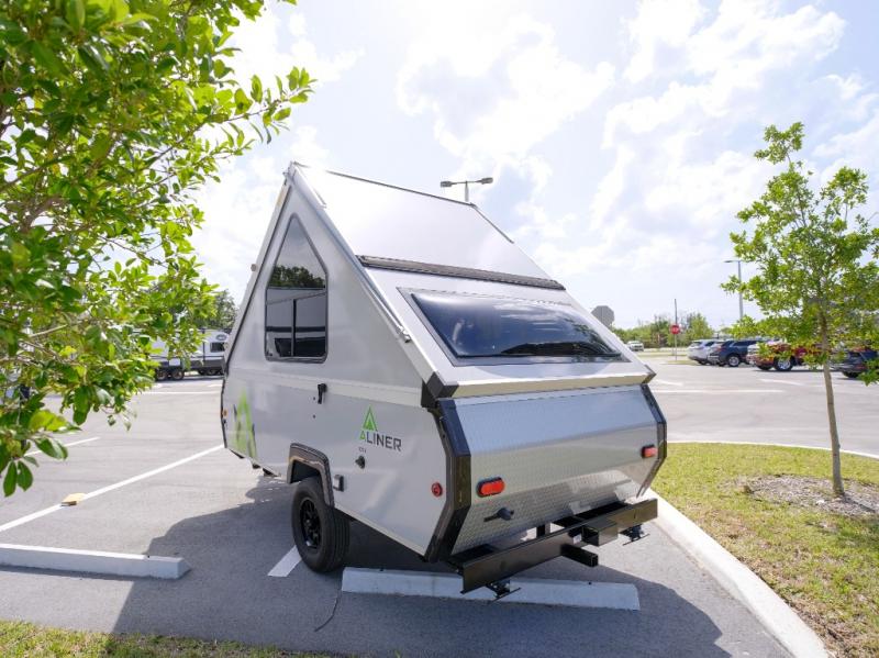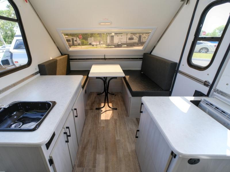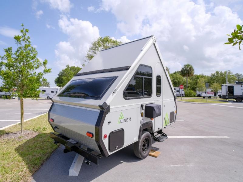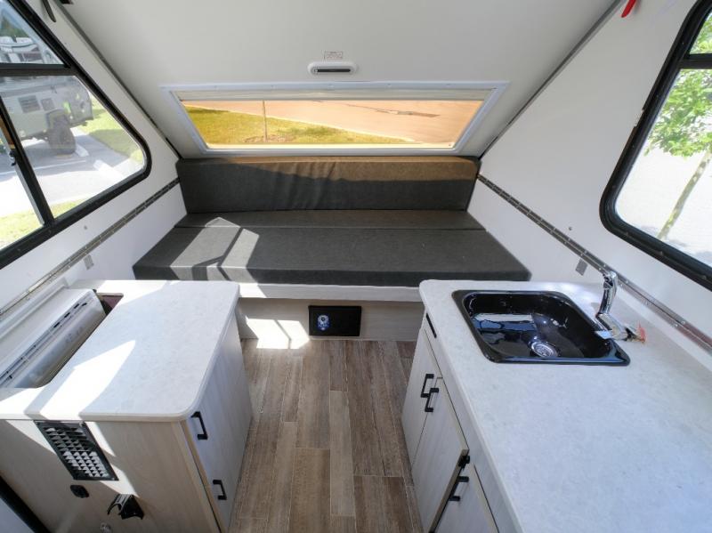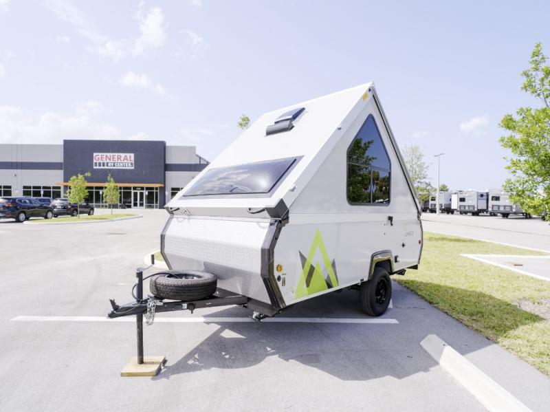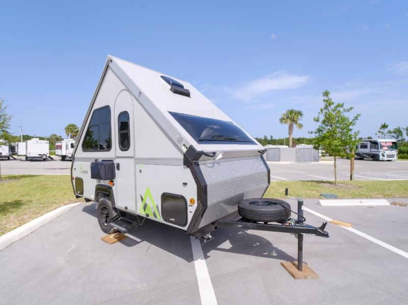 With the Scout A-frame camper by Aliner, there is an E-coated frame with powder coating on the front tongue and bumper, a diamond plate stone guard to protect against road debris, aluminum wheels, and a battery tray. There are vacuum bonded fiberglass panels, an Azdel lightweight, Thermoplastic composite interior wall and ceiling panels, and 10" electric brakes. You will also find a sink inside to wash your hands and dishes, two skylights with night shades and a door window for natural lighting, plus more!
