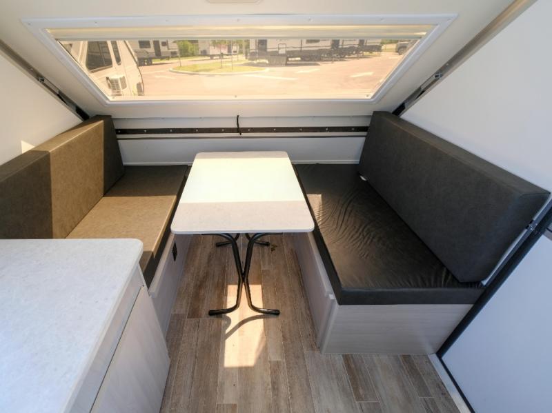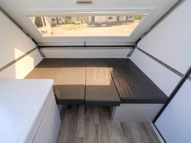 Get ready to sleep above ground as you upgrade from tent camping to this A-frame camper! It is easy to tow, set up and store when the fun is over. Inside you will find ample storage for your gear, a dinette to dine at when you aren't outside, a sofa bed to relax on before bedtime, and both furnishings covert to sleeping space. The dinette converts to a 46" x 76" bed, and there is storage under the seats. You will also have shelves to set your phone and such on. There are more features such as three electrical outlets inside, one outlet outside, high density foam, hypoallergenic cushions and mattress, a fantastic vent-fan, plus more!