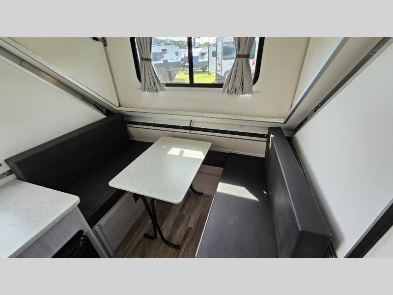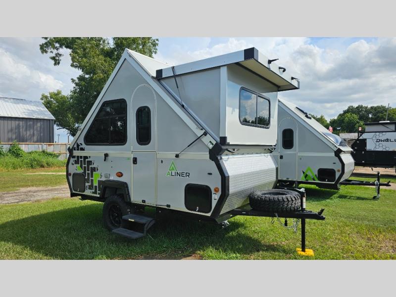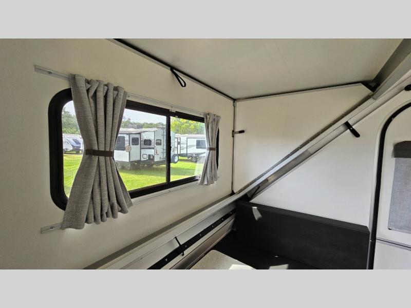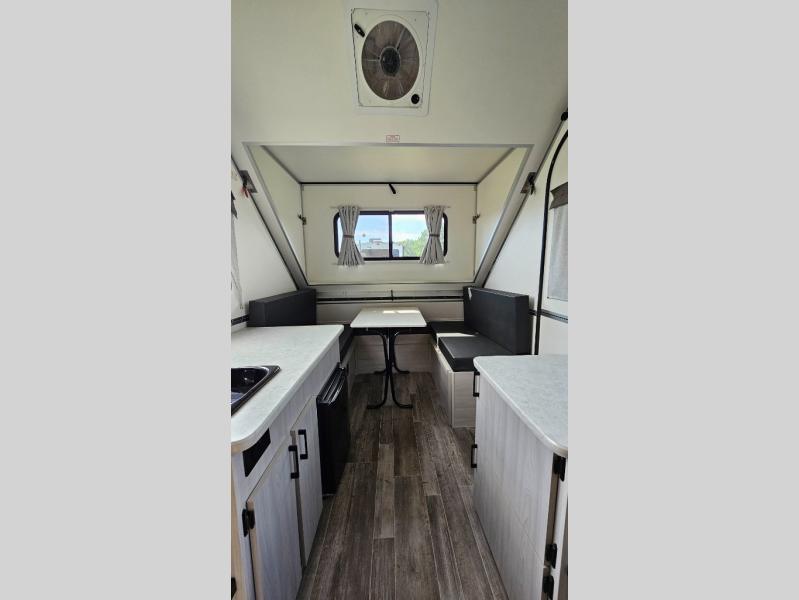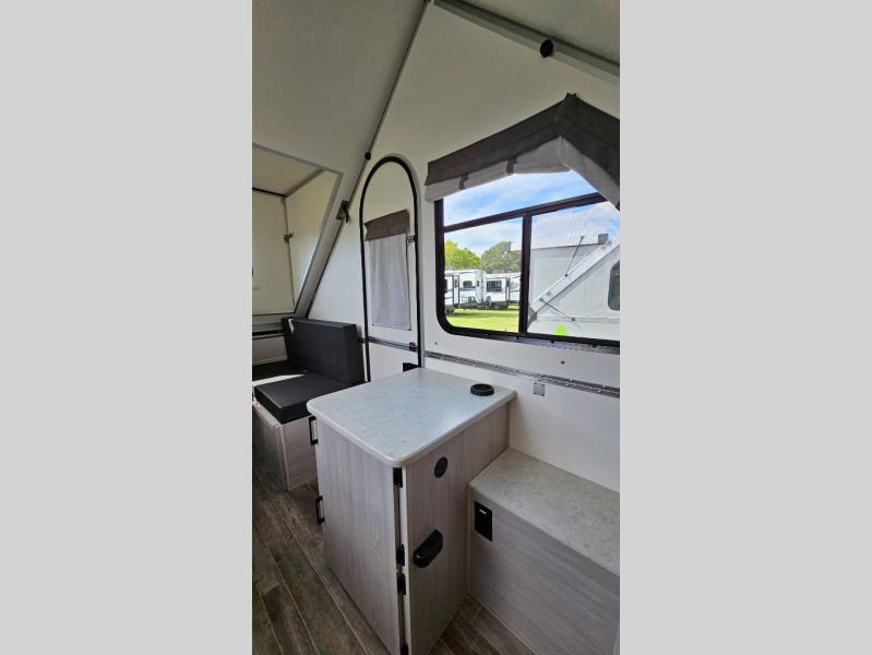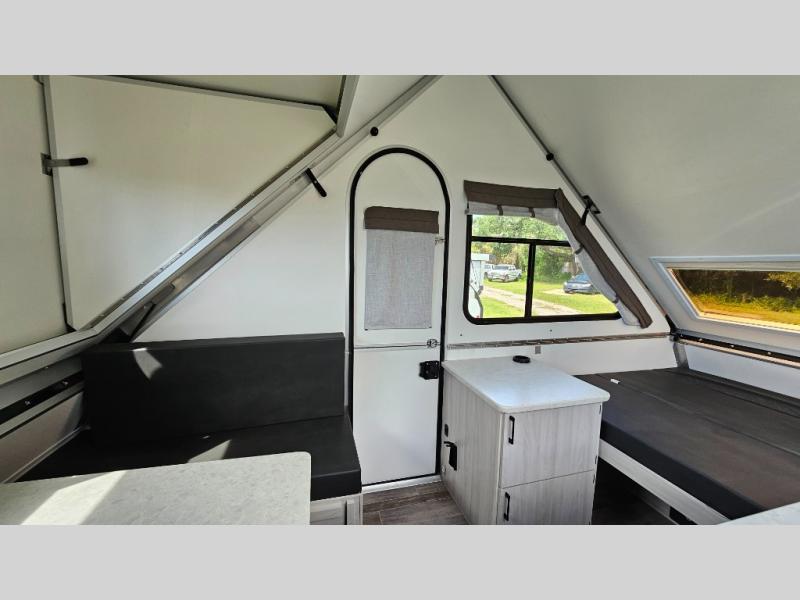 Get ready to sleep above ground as you upgrade from tent camping to this A-frame camper! It is easy to tow, set up and store when the fun is over. Inside you will find ample storage for your gear, a dinette to dine at when you aren't outside, a sofa bed to relax on before bedtime, and both furnishings covert to sleeping space. The dinette converts to a 46" x 76" bed, and there is storage under the seats. You will also have shelves to set your phone and such on. There are more features such as three electrical outlets inside, one outlet outside, high density foam, hypoallergenic cushions and mattress, a fantastic vent-fan, and options to choose from such as a front soft dormer, a rear soft dormer, and/or an Extreme Off-Road package, plus more!