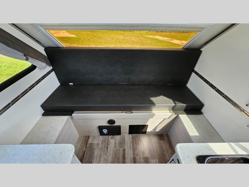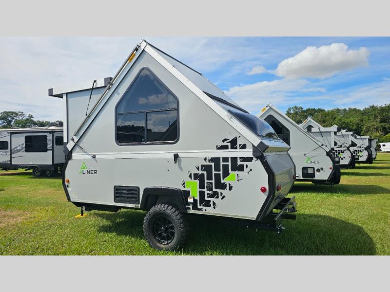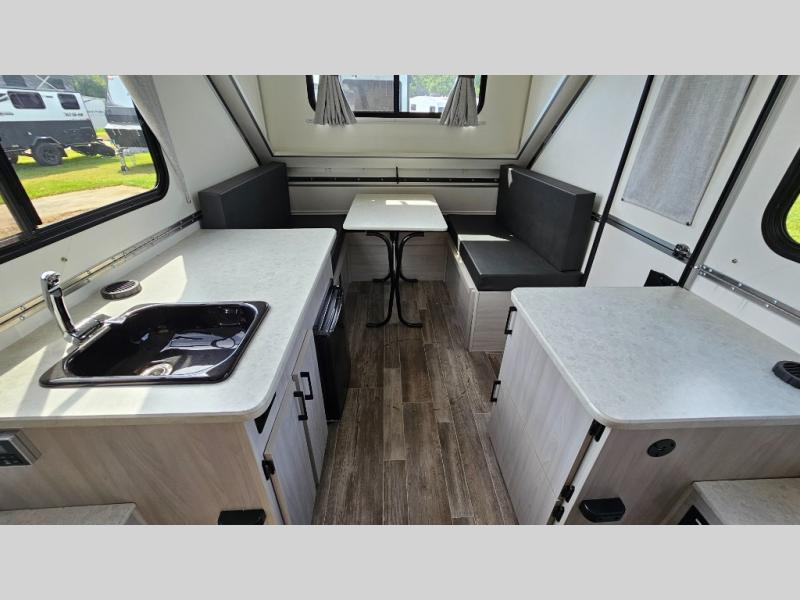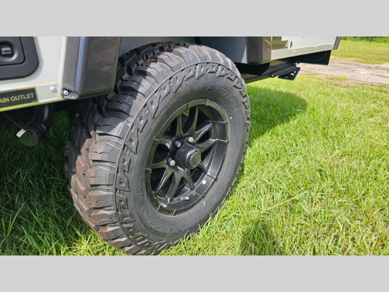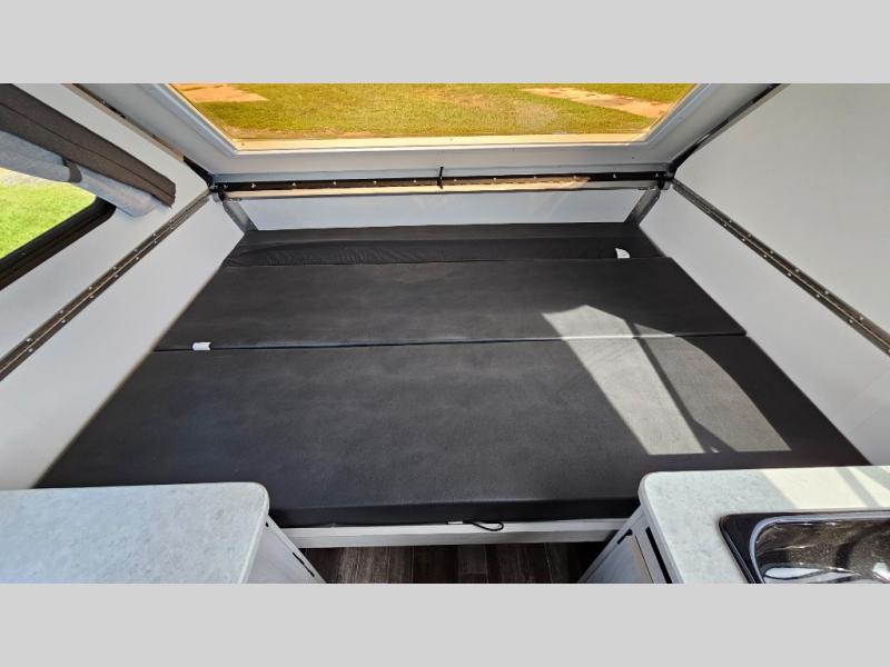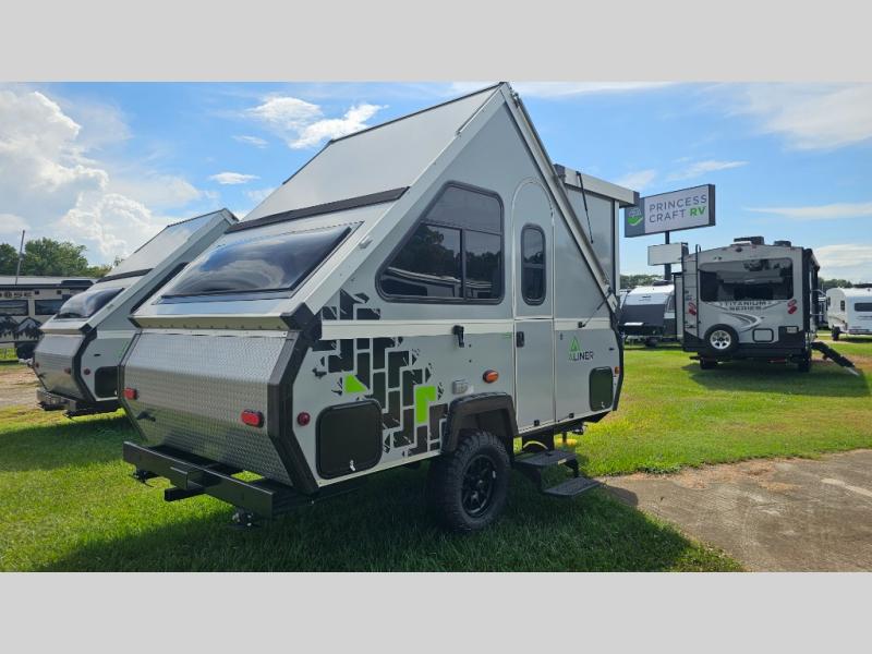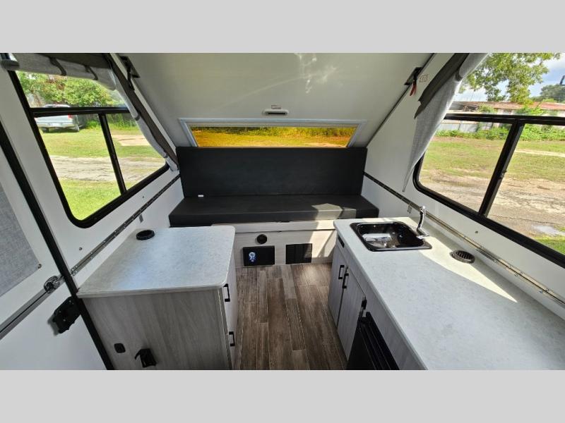 Get ready to sleep above ground as you upgrade from tent camping to this A-frame camper! It is easy to tow, set up and store when the fun is over. Inside you will find ample storage for your gear, a dinette to dine at when you aren't outside, a sofa bed to relax on before bedtime, and both furnishings covert to sleeping space. The dinette converts to a 46" x 76" bed, and there is storage under the seats. You will also have shelves to set your phone and such on. There are more features such as three electrical outlets inside, one outlet outside, high density foam, hypoallergenic cushions and mattress, a fantastic vent-fan, and options to choose from such as a front soft dormer, a rear soft dormer, and/or an Extreme Off-Road package, plus more!