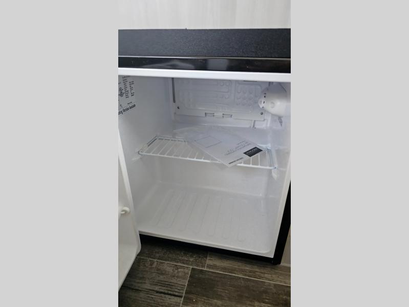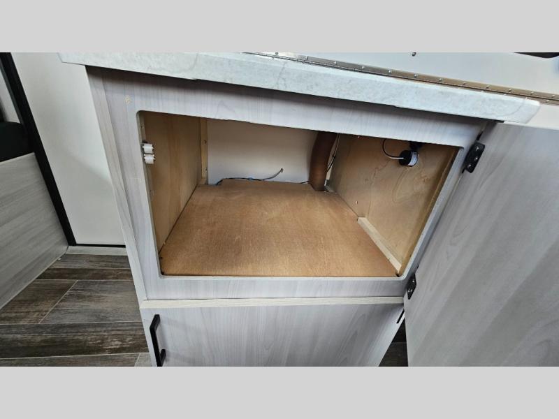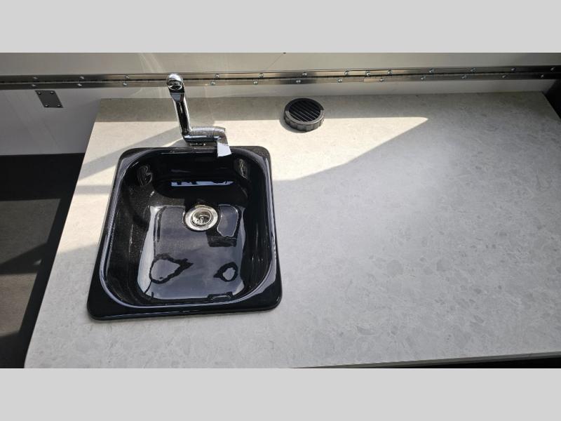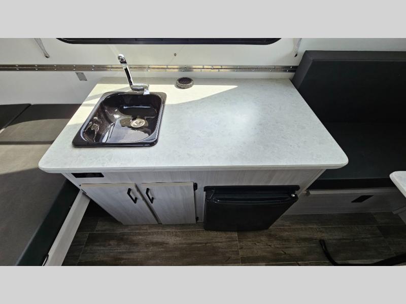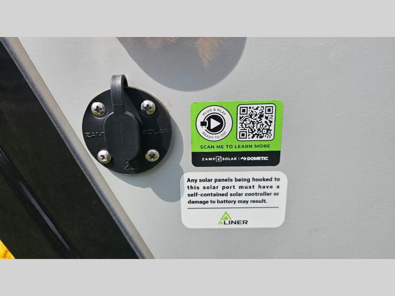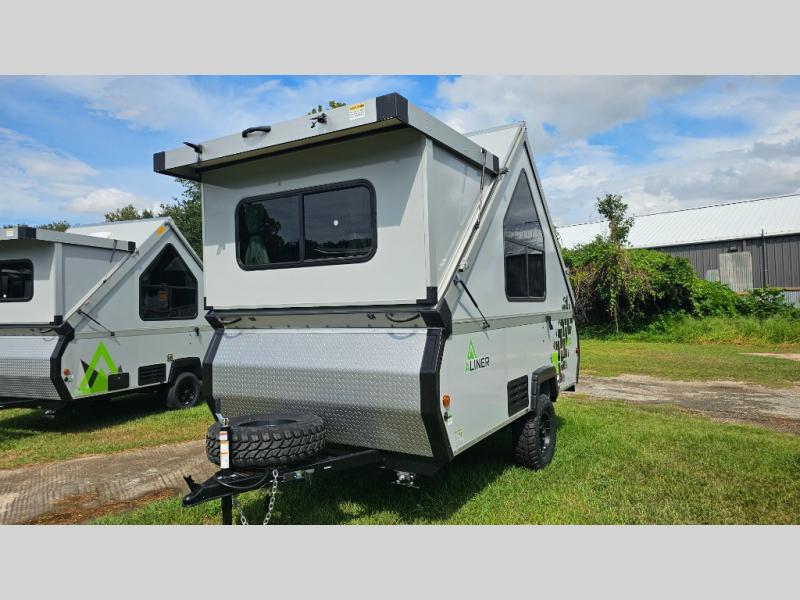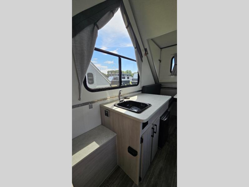 With the Scout A-frame camper by Aliner, there is an E-coated frame with powder coating on the front tongue and bumper, a diamond plate stone guard to protect against road debris, aluminum wheels, and a battery tray. There are vacuum bonded fiberglass panels, an Azdel lightweight, Thermoplastic composite interior wall and ceiling panels, and 10" electric brakes. You will also find a sink inside to wash your hands and dishes, two skylights with night shades and a door window for natural lighting, plus more!