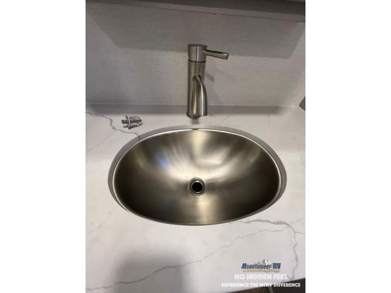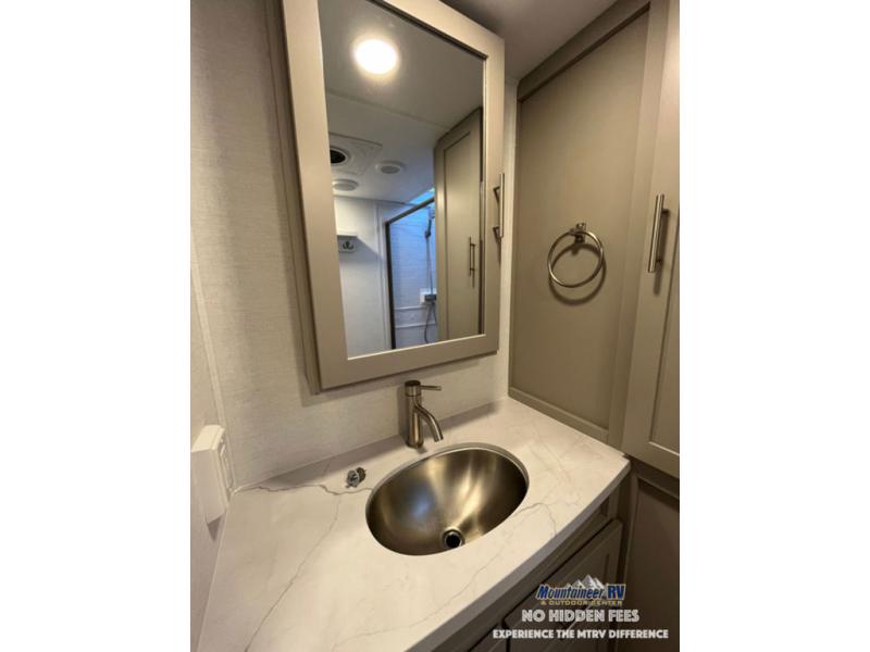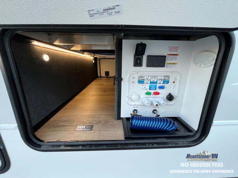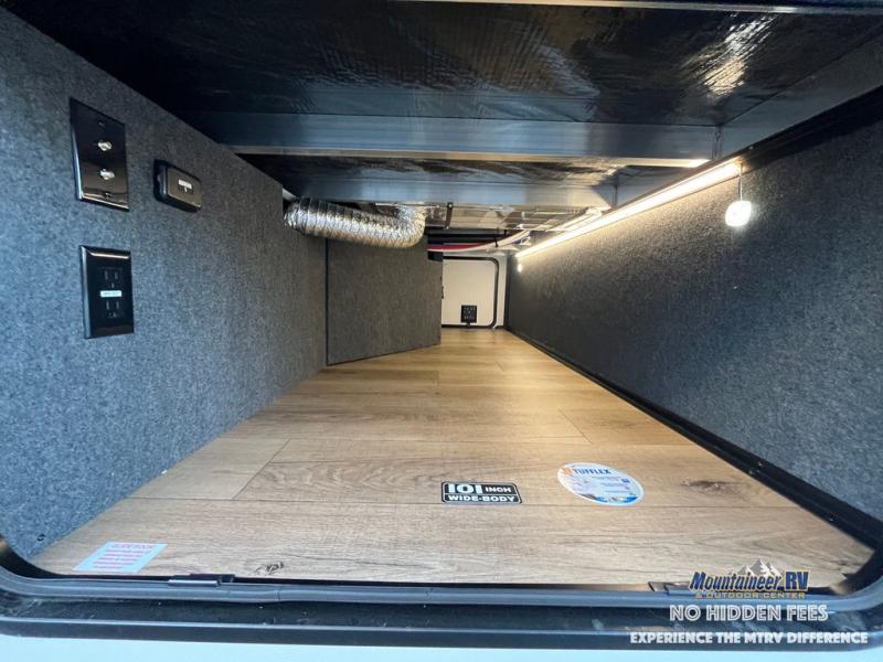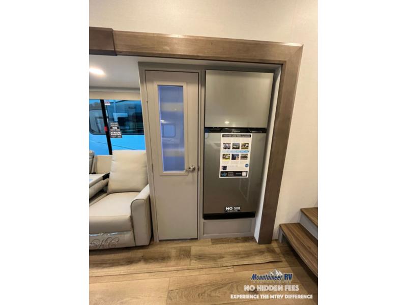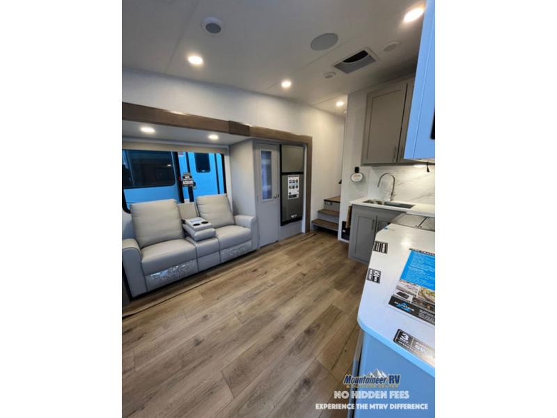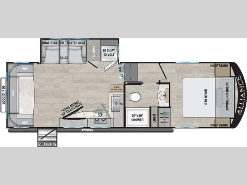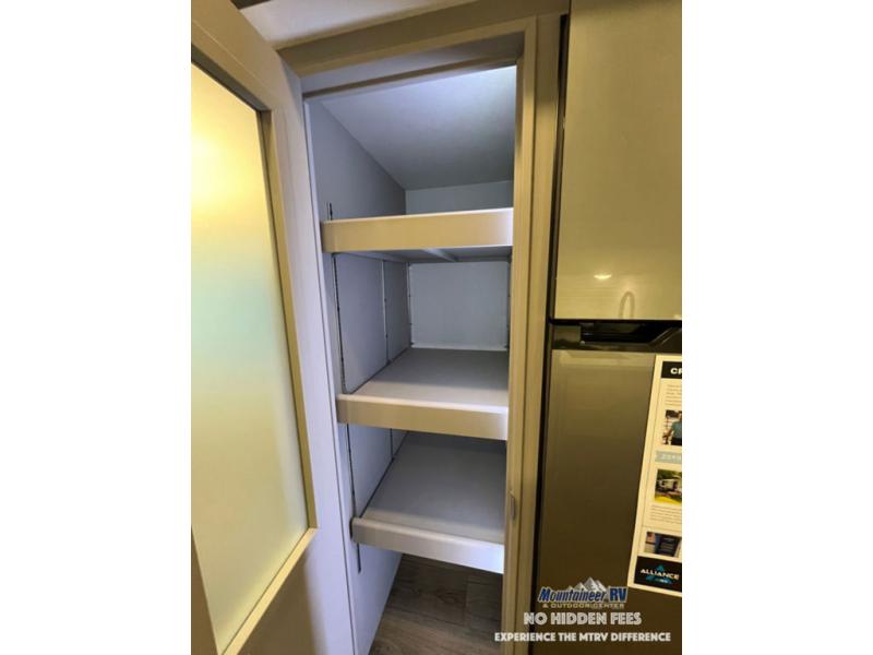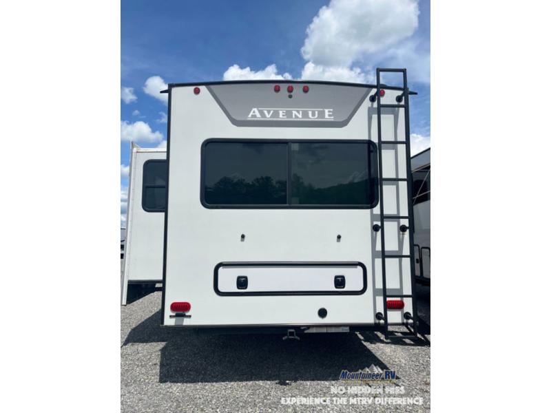 A benchmark chassis creates a space saver upper deck with each one of these Avenue All-Access fifth wheels by Alliance RV! The 101 in. wide-body construction gives you more room to walk around and the flush slide out floors throughout prevent any tripping. There are Azdel composite sidewalls inside and out, and a seamless fully walkable PVC roof for extreme durability and zero maintenance. You are sure to love no carpet throughout making each Avenue All-Access easy to clean and allergen free, not to mention pet friendly. You can maximize your space throughout with innovative storage solutions like the hidden storage behind the TV, inside the end tables, ottoman, and dinette chairs. These units also include the OTG Solar Package with a 200 watt solar panel, 15 amp MPPT charger, multiple outlets, and more to keep you powered up!