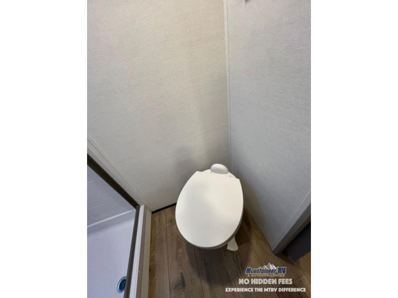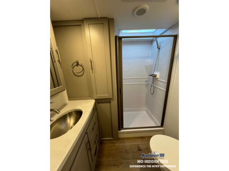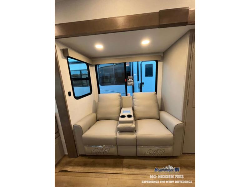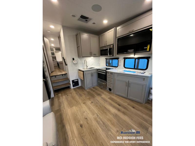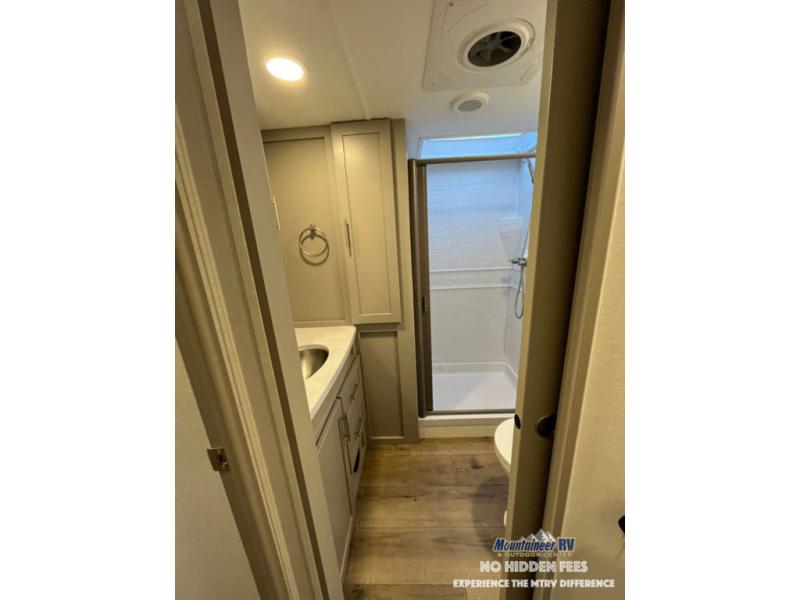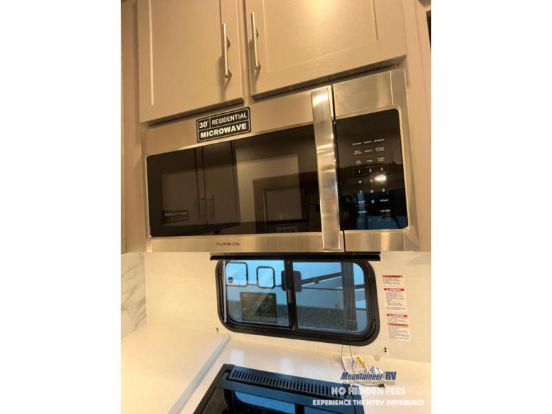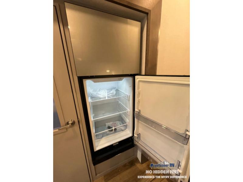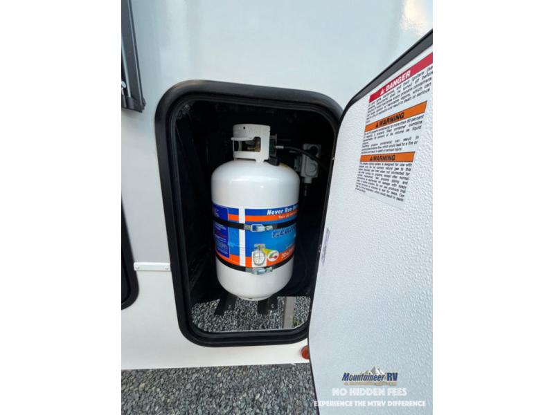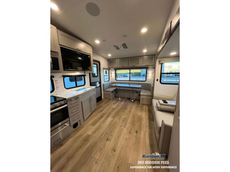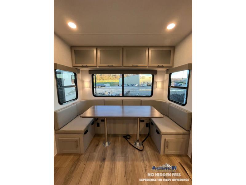 Escape to your favorite destinations with your favorite person in this fifth wheel! The front private bedroom has a queen bed with nightstands on either side to set a glass of water on, and a wardrobe to keep your clothes looking nice. Freshen up each morning in the full bathroom with a 30" x 36" shower, and grab a towel stored close by in the linen closet. Now that you're ready for the day, you can head to the kitchen and grab some eggs from the 10 cu. ft. 12V refrigerator to fry up using the three burner cooktop, plus there is a flip-up butcher block to make dinner prep easier. Spend your evenings in true relaxation seated on the sofa slide out across from the swing mount 40" HDTV. You also have a rear booth dinette with overhead storage!