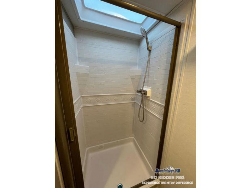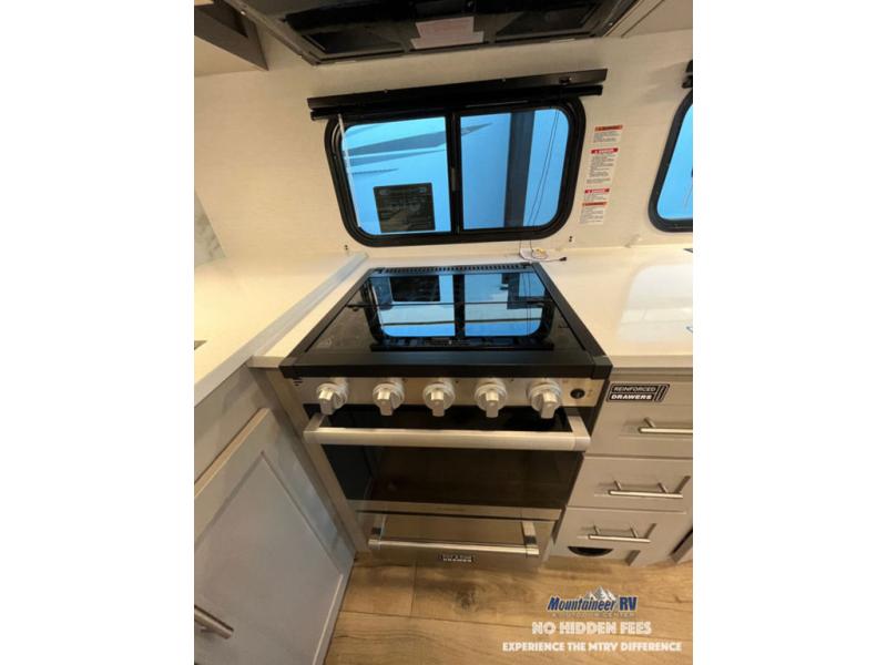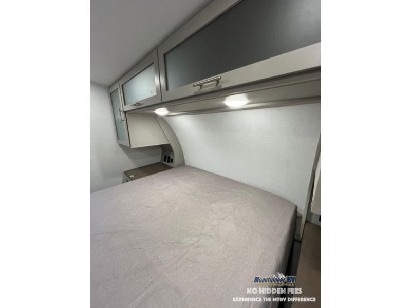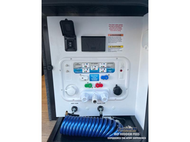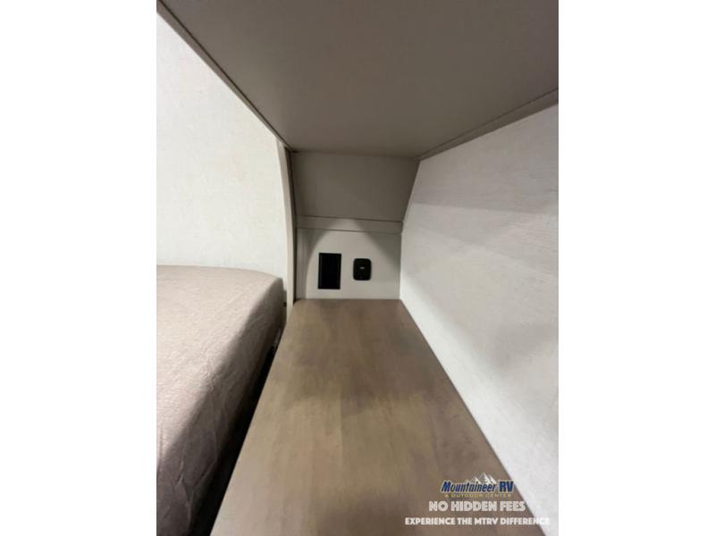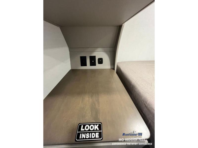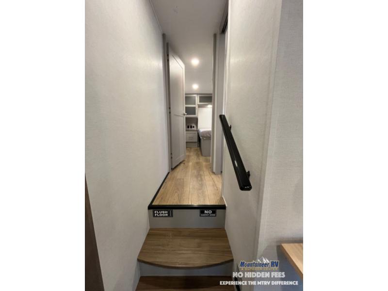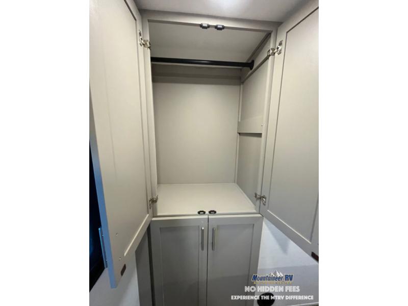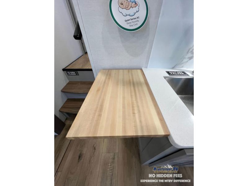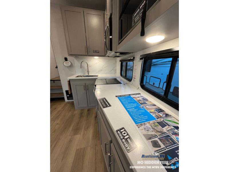 Escape to your favorite destinations with your favorite person in this fifth wheel! The front private bedroom has a queen bed with nightstands on either side to set a glass of water on, and a wardrobe to keep your clothes looking nice. Freshen up each morning in the full bathroom with a 30" x 36" shower, and grab a towel stored close by in the linen closet. Now that you're ready for the day, you can head to the kitchen and grab some eggs from the 10 cu. ft. 12V refrigerator to fry up using the three burner cooktop, plus there is a flip-up butcher block to make dinner prep easier. Spend your evenings in true relaxation seated on the sofa slide out across from the swing mount 40" HDTV. You also have a rear booth dinette with overhead storage!