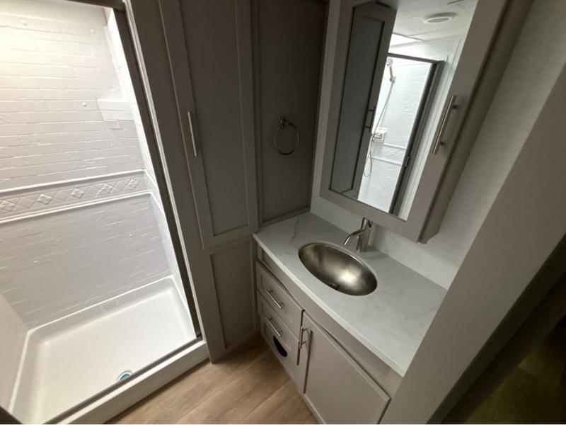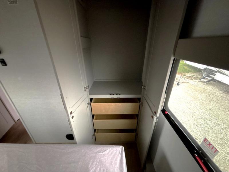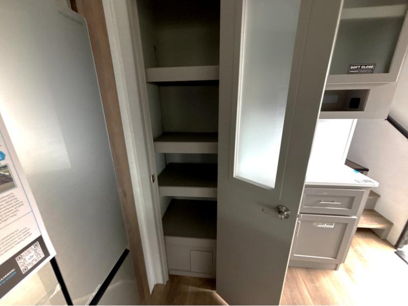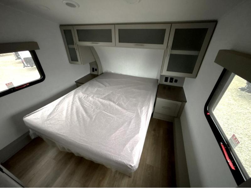 For the couple that enjoys adventures, this rear living coach has everything you need to travel comfortably and take along a couple of friends! The front private bedroom has a queen bed with nightstands on either side for your personal belongings, and a wardrobe to keep your clothes looking nice. Freshen up each morning in the full bathroom with a 30" x 36" shower, and grab a towel stored close by in the linen closet. Now that you're ready for the day, you can head to the kitchen and create a hearty breakfast with the full kitchen amenities. You will appreciate having a 10 cu. ft. 12V refrigerator and three burner cooktop, plus there is a center island with plenty of counter space and a sink to make food prep even easier. Spend your evenings in true relaxation in the dual recliner theater seats across from the swing mount 50" HDTV with hidden storage behind. You will also love the pantry and hutch in the kitchen area for storing all of your dishes and non-perishables. Dine at the floating table with two chairs along with a moveable ottoman featuring storage.
