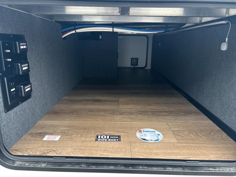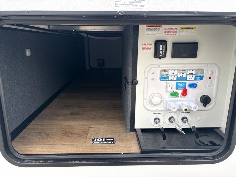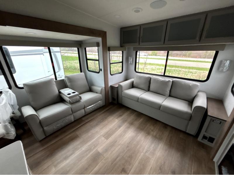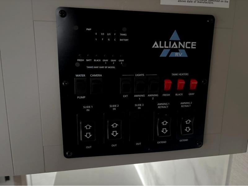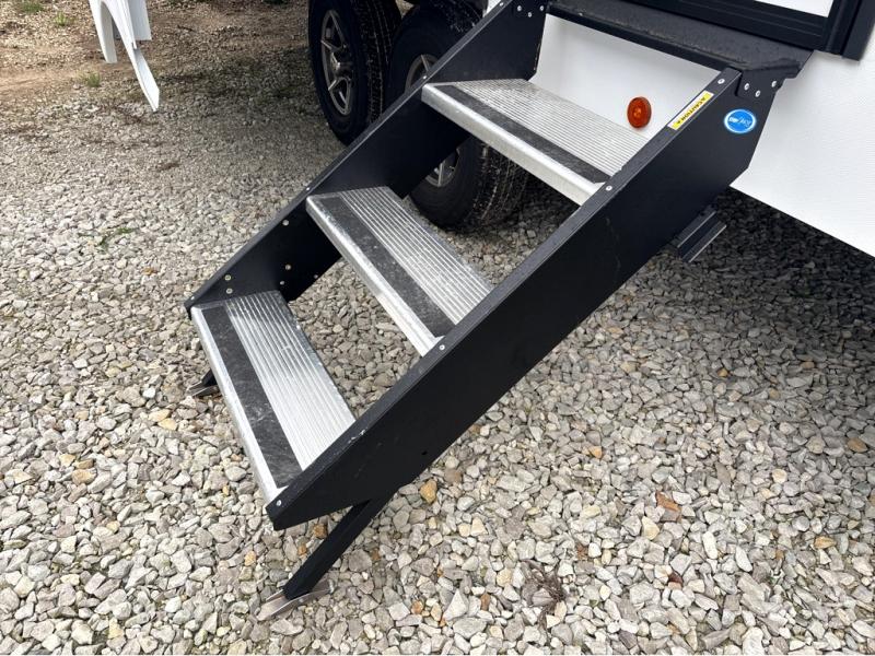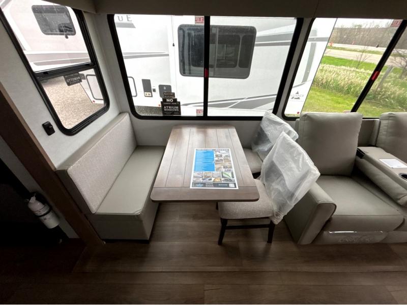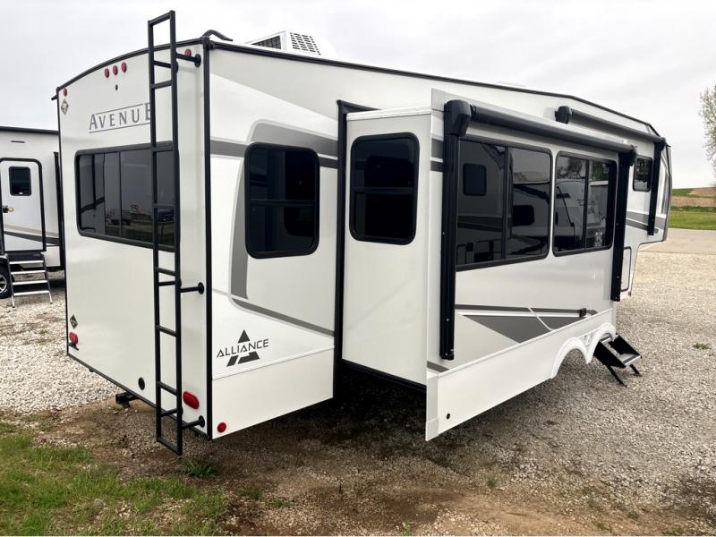 A benchmark chassis creates a space saver upper deck with each one of these Avenue All-Access fifth wheels by Alliance RV! The 101 in. wide-body construction gives you more room to walk around and the flush slide out floors throughout prevent any tripping. There are Azdel composite sidewalls inside and out, and a seamless fully walkable PVC roof for extreme durability and zero maintenance. You are sure to love the "no carpet zone" making each Avenue easy to clean and allergen free, not to mention pet friendly. You can maximize your space throughout with innovative storage solutions like the hidden storage behind the TV, inside the end tables, ottoman, and dinette chairs. These units also include the OTG Solar Package with a 200 watt solar panel, 15 amp MPPT charger, multiple outlets, and more to keep you powered up!