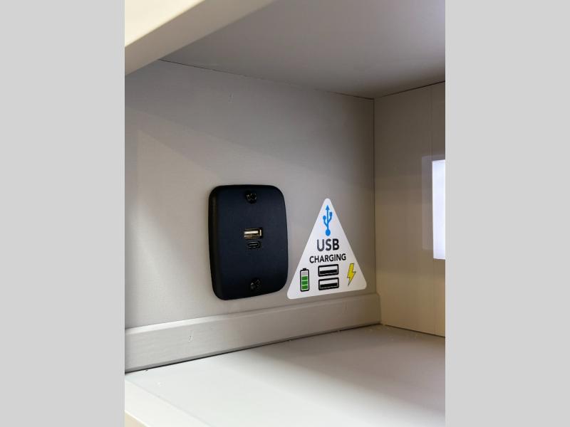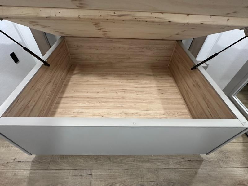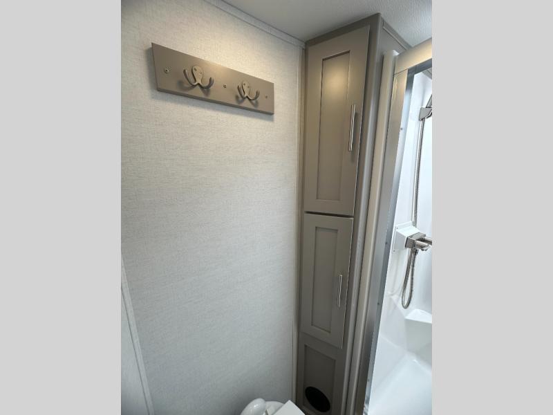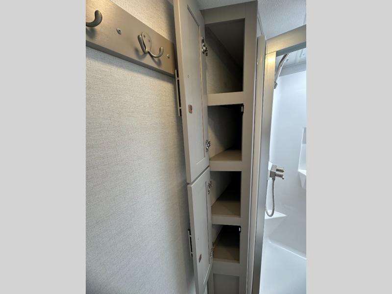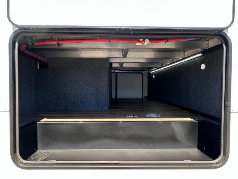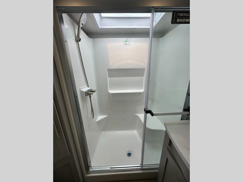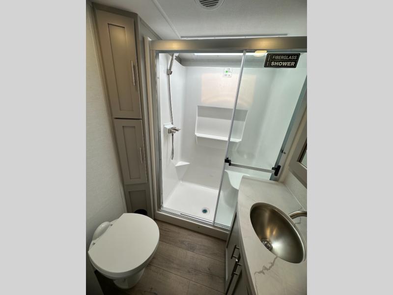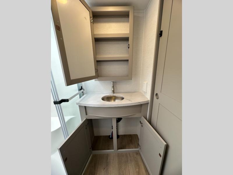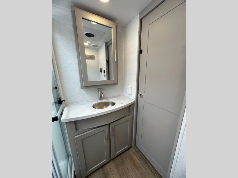 Bathroom Facilities: The trailer includes a full bathroom with a shower, toilet, and vanity, ensuring all necessary amenities are available.