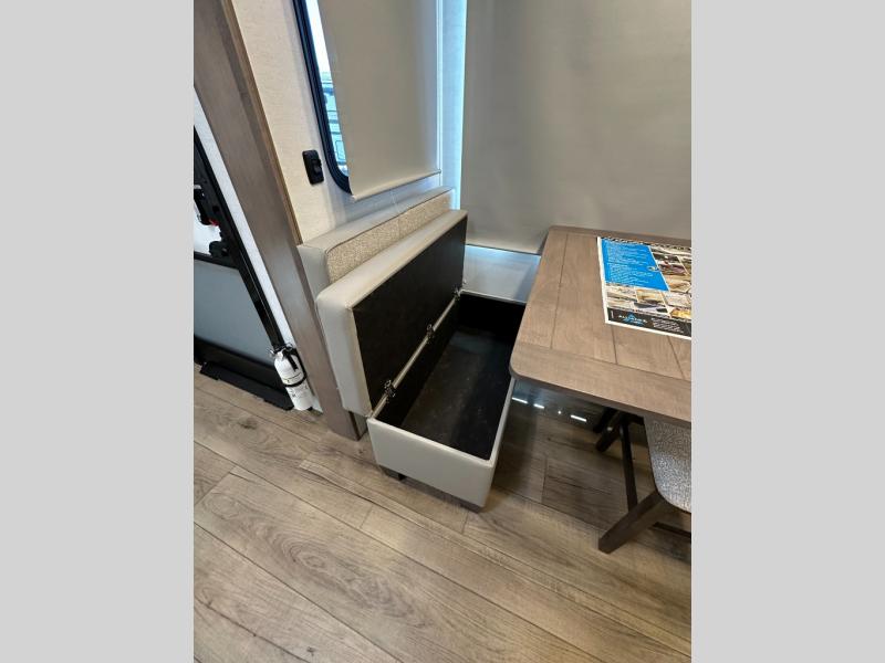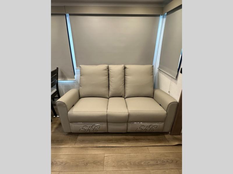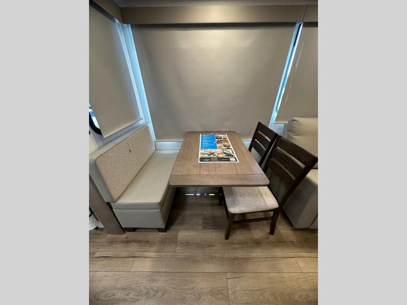 Living Area: A spacious rear living area includes a sofa and a booth dinette, creating a comfortable space for relaxation and dining.