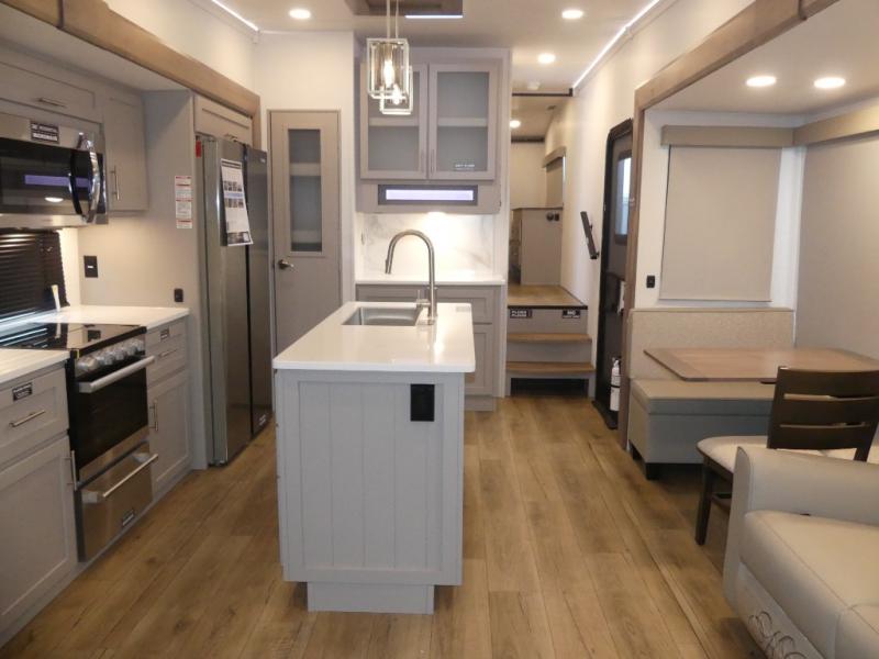 With any Avenue fifth wheel or travel trailer by Alliance RV, you will enjoy more interior space provided by the 8' 5" wide-body construction, and a long list of luxury features. Each is built with Azdel composite sidewalls both inside and out, along with a PVC roof for added strength. There are innovative storage solutions that include hidden storage behind the TV, within end tables and ottomans, and more. Since these units feature no carpet throughout, cleaning will be easier than ever, and there are flush floor slides throughout for seamless living spaces. The Avenue also comes with the OTG Solar Package with a 400 watt solar panel, inverter prep, multiple outlets, and more to keep you charged up!