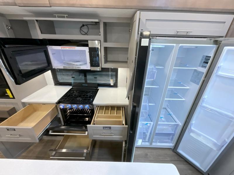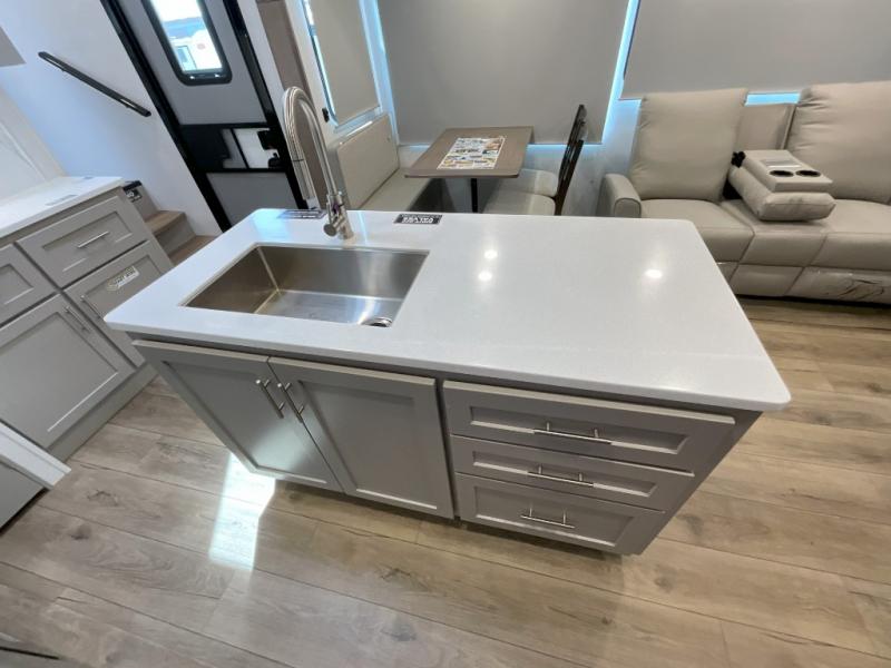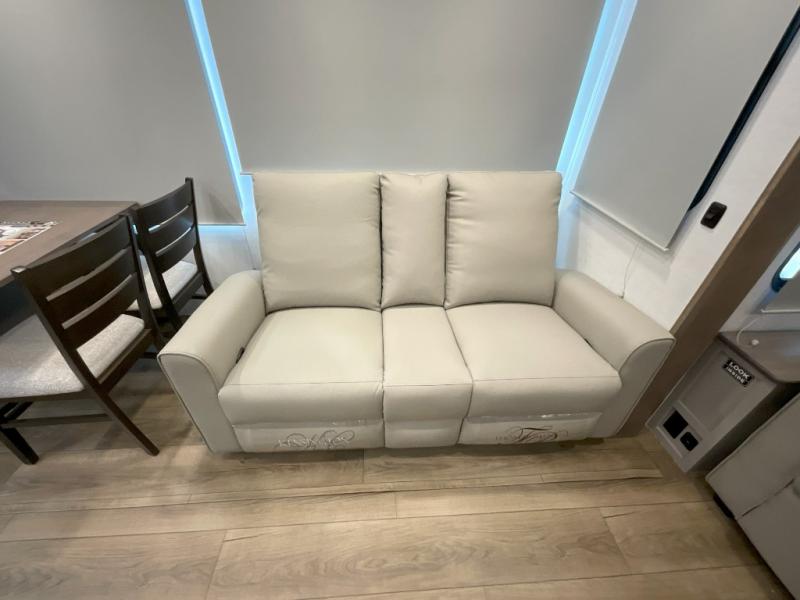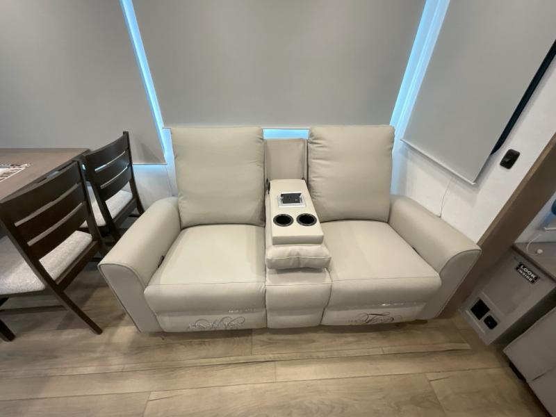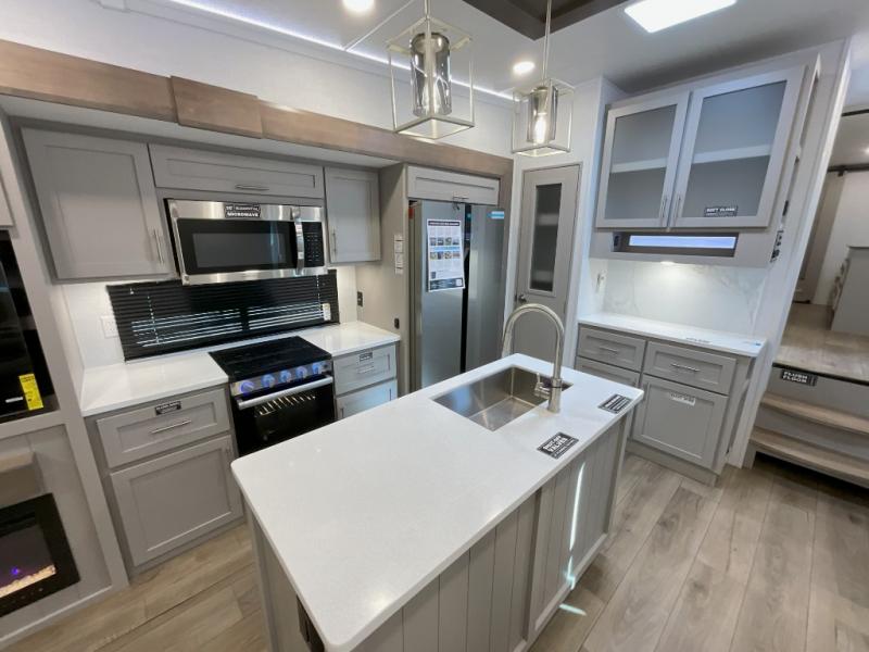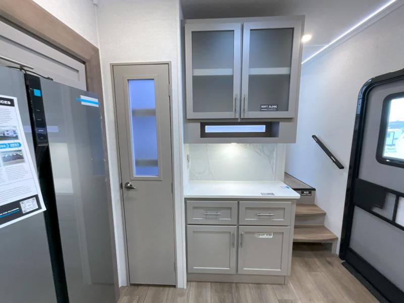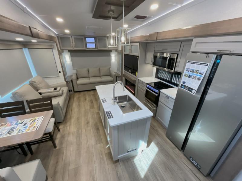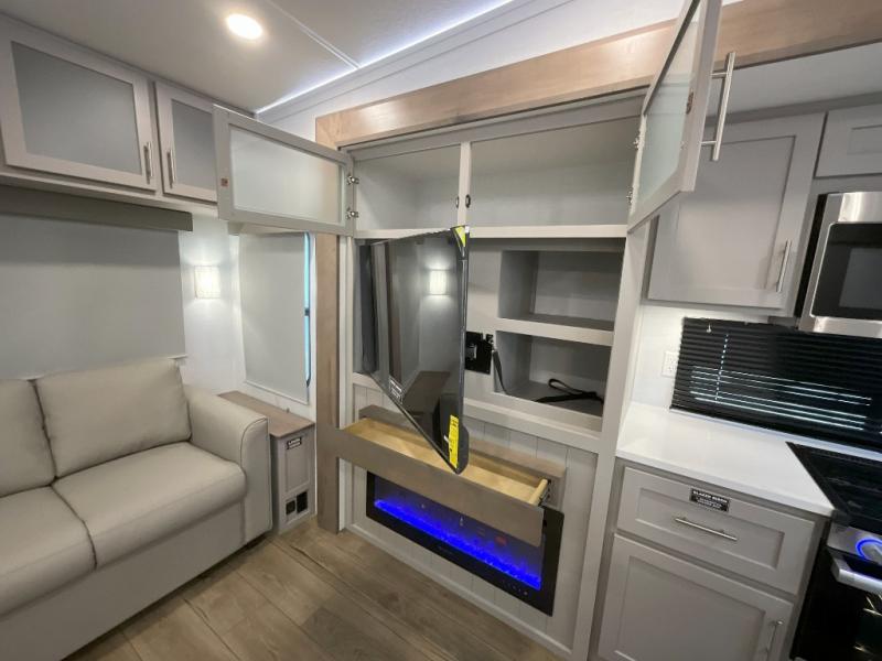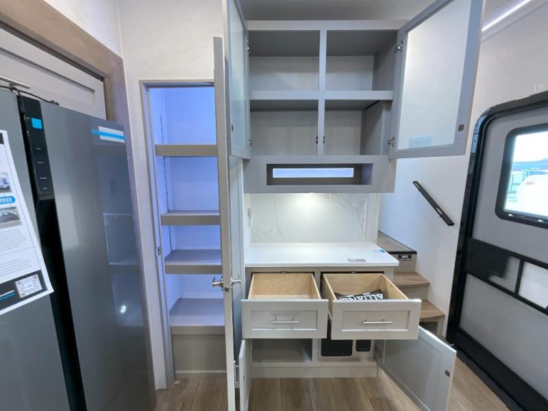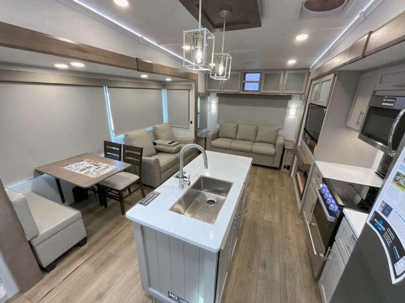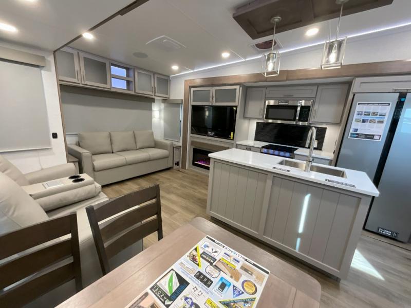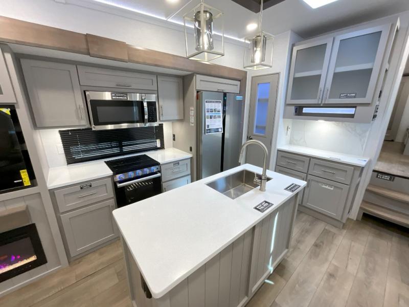 A kitchen island with countertop space makes it easy to prepare meals in this fifth wheel! The floating dinette table has two chairs on one side and a movable ottoman with flip up storage on the other side to keep your games or extra table cloths in. You can store your dishes and snacks inside the hutch/pantry or in the second pantry. The front private bedroom has a queen bed slide but can be switched out for the optional king bed if you like. There is also a dresser and large wardrobe for storage, and either side of the wardrobe with washer and dryer prep. The rear living area features a dual recliner theater seat across from an entertainment center with a 50" class HDTV with hidden storage behind it, and is also on a swing mount for all to see even at the rear sleeper sofa!