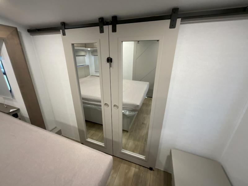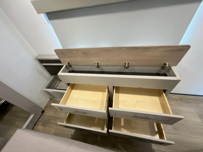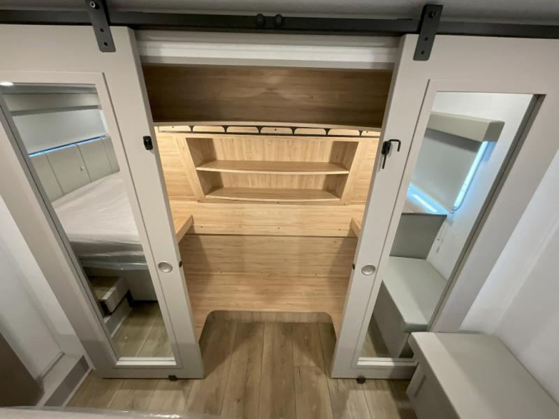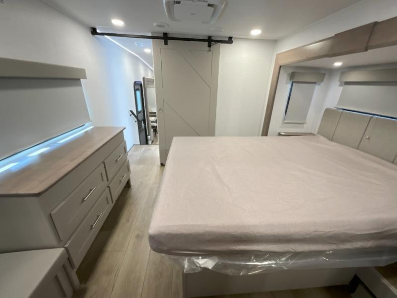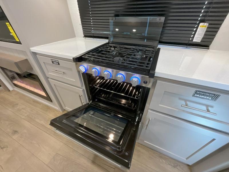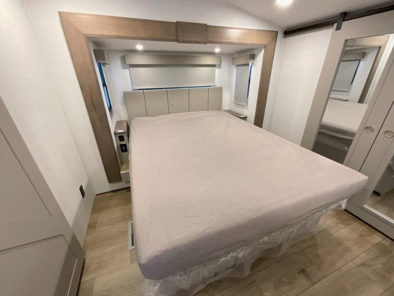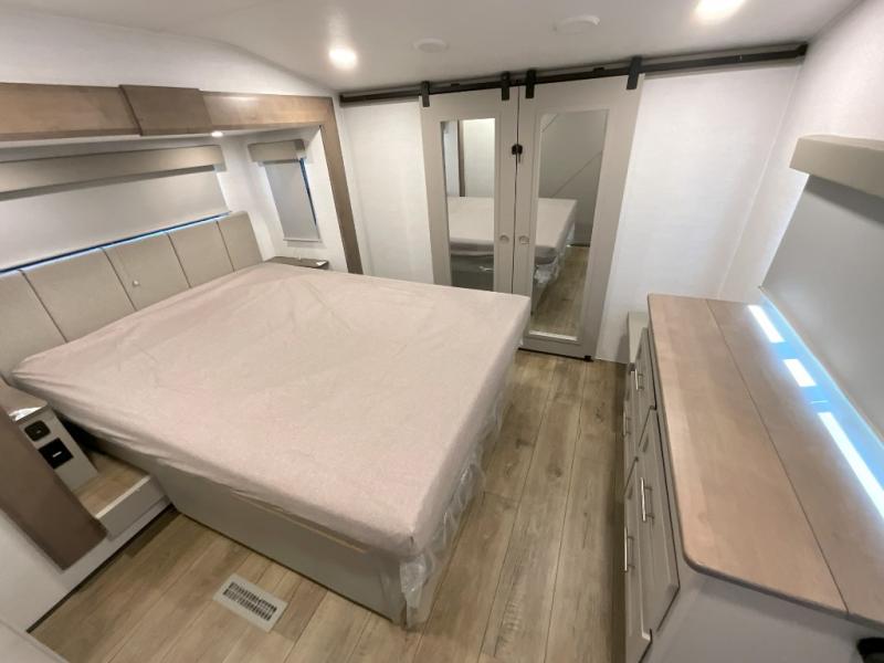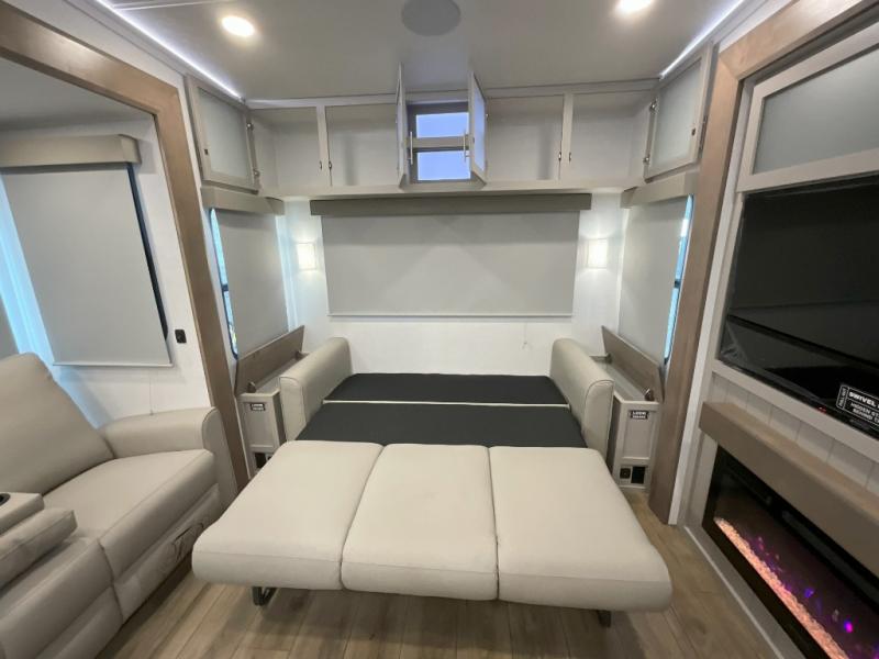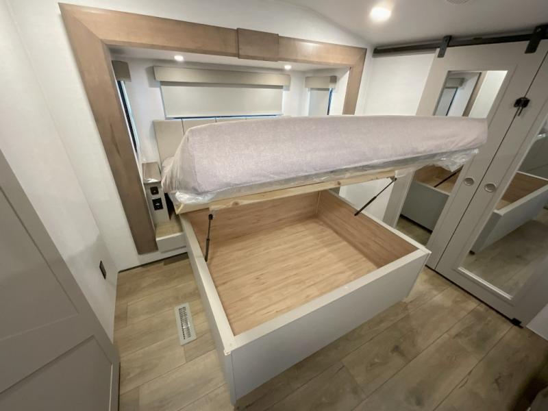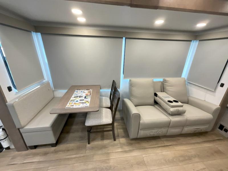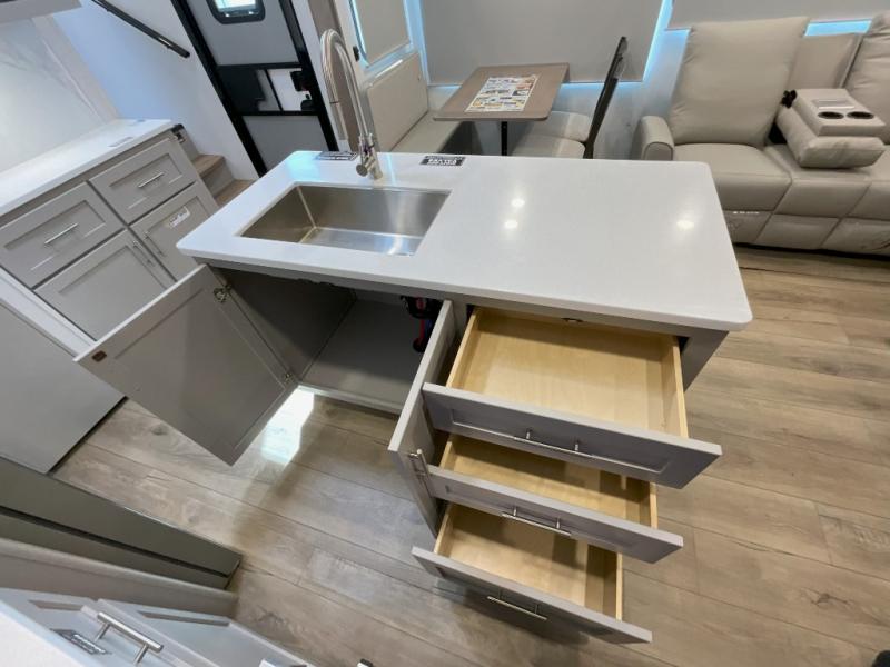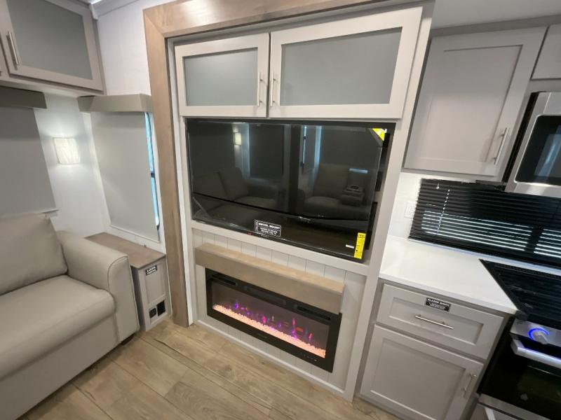 A kitchen island with countertop space makes it easy to prepare meals in this fifth wheel! The floating dinette table has two chairs on one side and a movable ottoman with flip up storage on the other side to keep your games or extra table cloths in. You can store your dishes and snacks inside the hutch/pantry or in the second pantry. The front private bedroom has a queen bed slide but can be switched out for the optional king bed if you like. There is also a dresser and large wardrobe for storage, and either side of the wardrobe with washer and dryer prep. The rear living area features a dual recliner theater seat across from an entertainment center with a 50" class HDTV with hidden storage behind it, and is also on a swing mount for all to see even at the rear sleeper sofa!