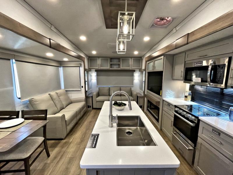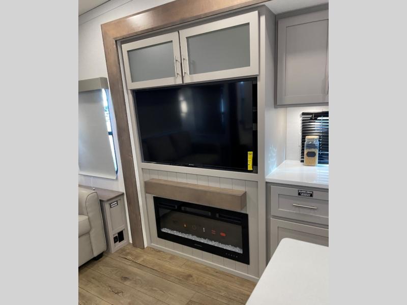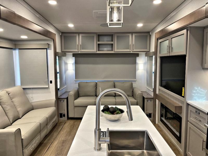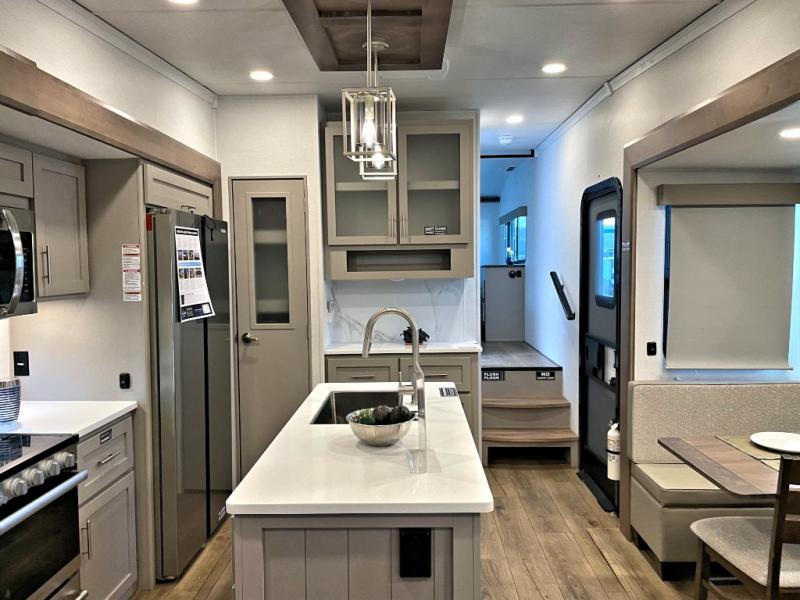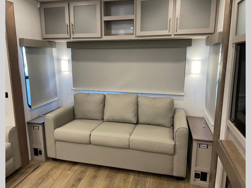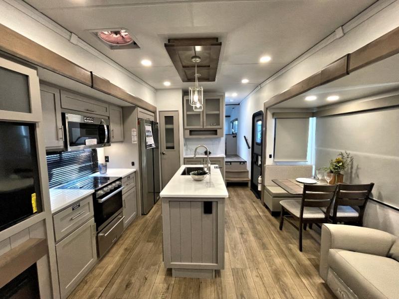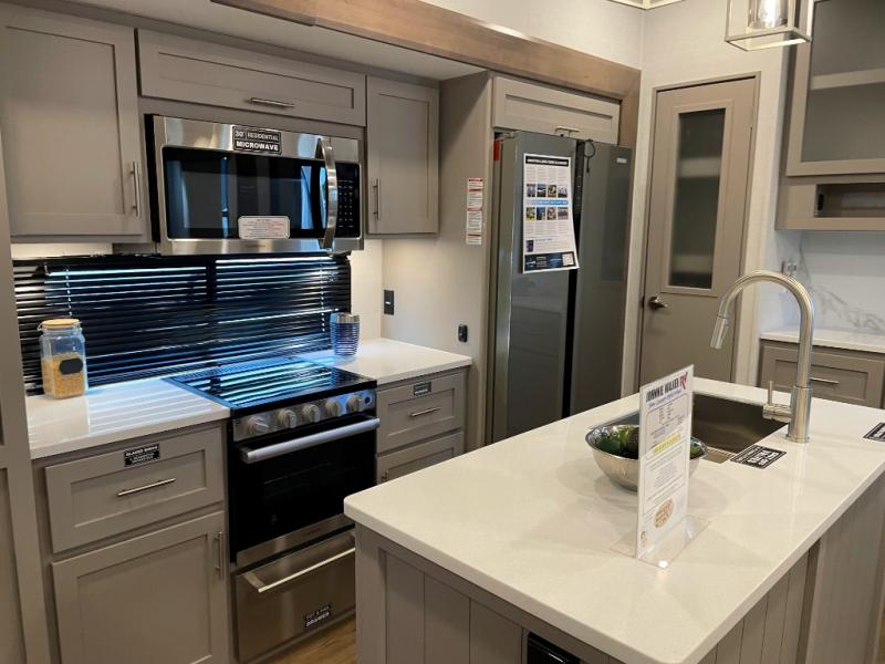 A kitchen island with countertop space makes it easy to prepare meals in this fifth wheel! The floating dinette table has two chairs on one side and a movable ottoman with flip up storage on the other side to keep your games or extra table cloths in. You can store your dishes and snacks inside the hutch/pantry or in the second pantry. The front private bedroom has a queen bed slide but can be switched out for the optional king bed if you like. There is also a dresser and large wardrobe for storage, and either side of the wardrobe with washer and dryer prep. The rear living area features a dual recliner theater seat across from an entertainment center with a 50" class HDTV with hidden storage behind it, and is also on a swing mount for all to see even at the rear sleeper sofa!