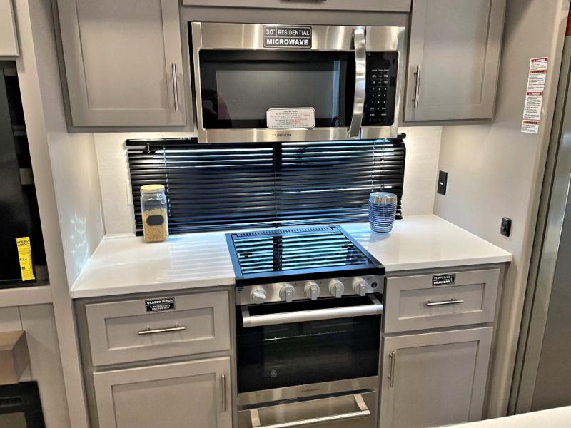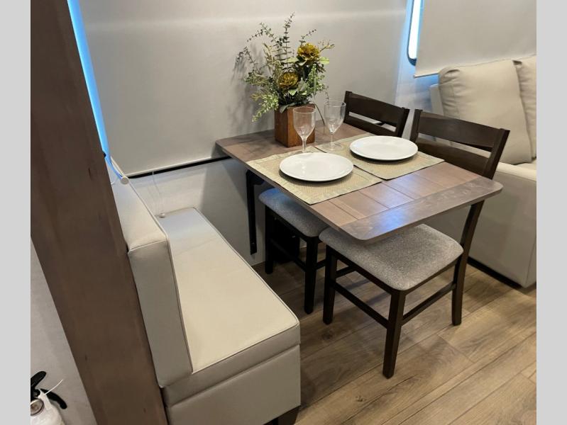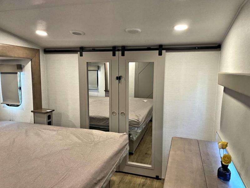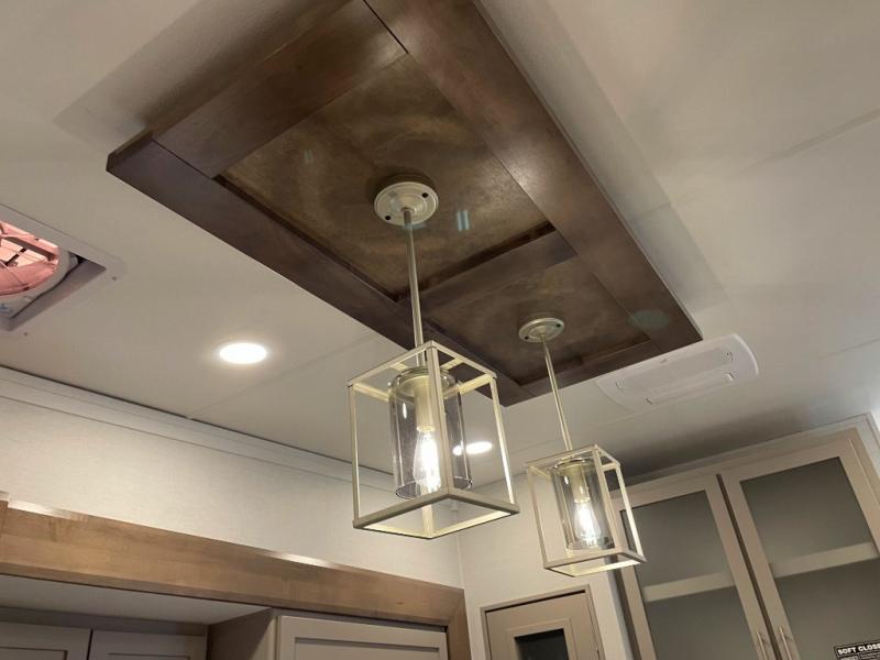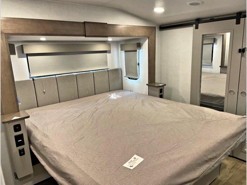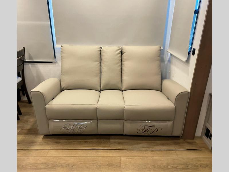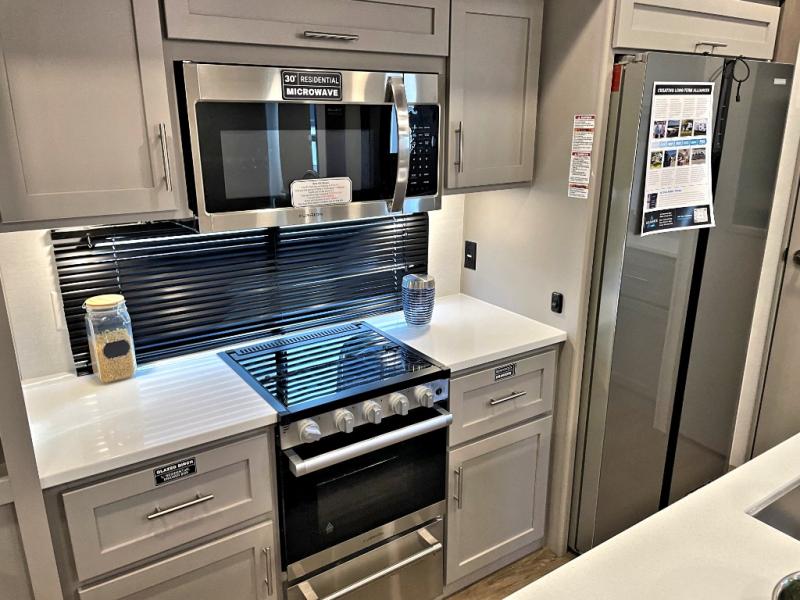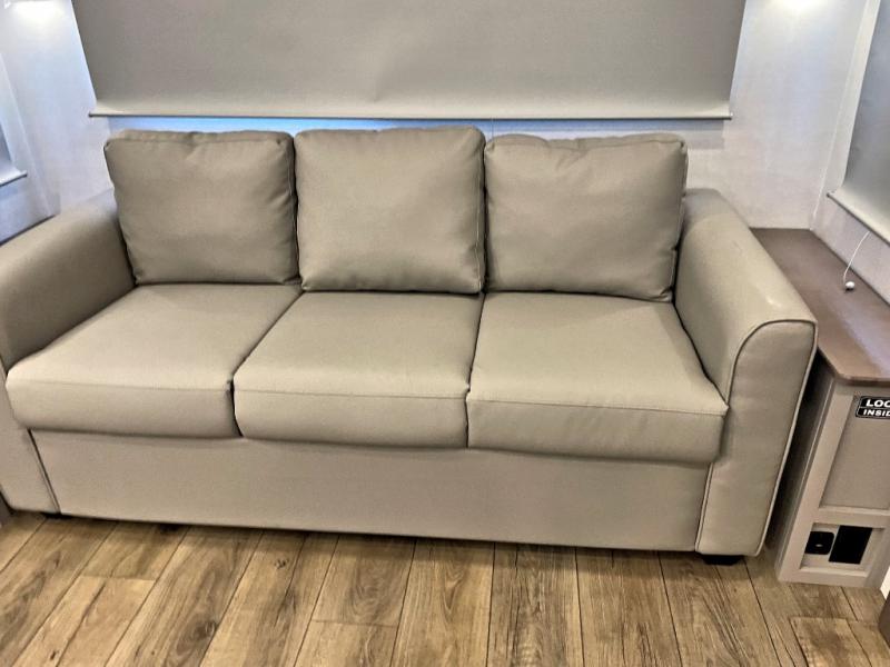 A kitchen island with countertop space makes it easy to prepare meals in this fifth wheel! The floating dinette table has two chairs on one side and a movable ottoman with flip up storage on the other side to keep your games or extra table cloths in. You can store your dishes and snacks inside the hutch/pantry or in the second pantry. The front private bedroom has a queen bed slide but can be switched out for the optional king bed if you like. There is also a dresser and large wardrobe for storage, and either side of the wardrobe with washer and dryer prep. The rear living area features a dual recliner theater seat across from an entertainment center with a 50" class HDTV with hidden storage behind it, and is also on a swing mount for all to see even at the rear sleeper sofa!