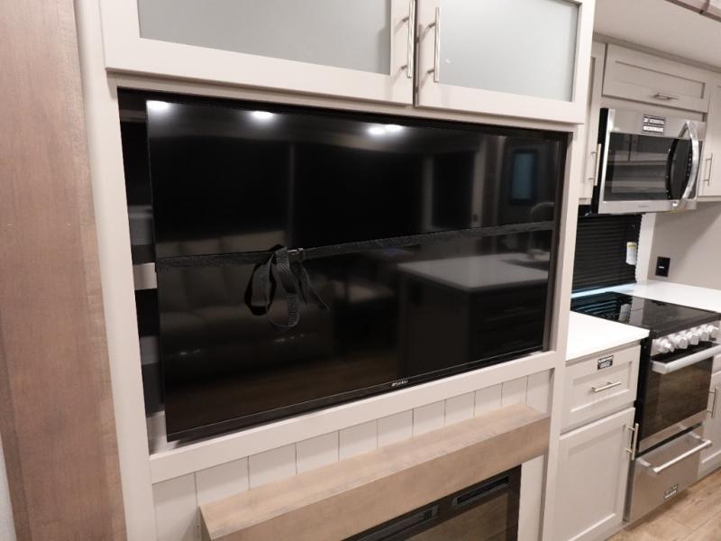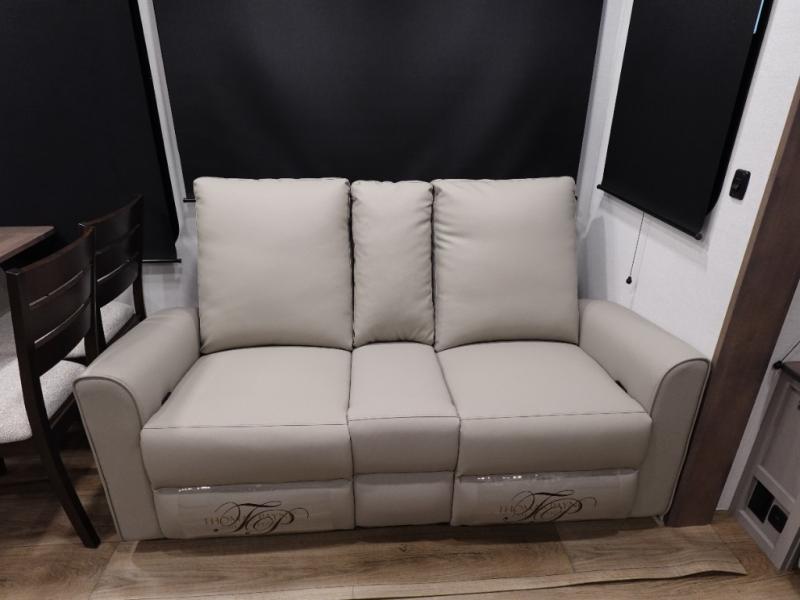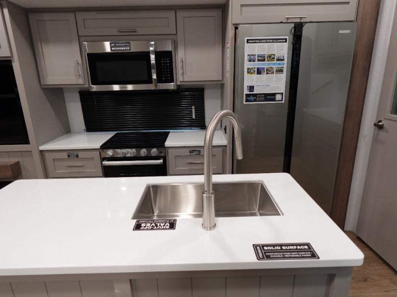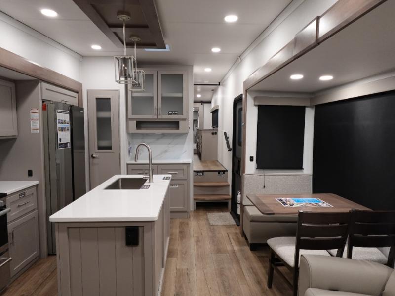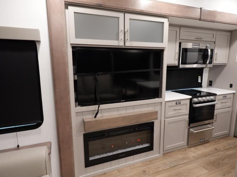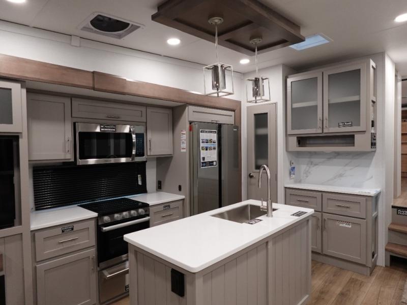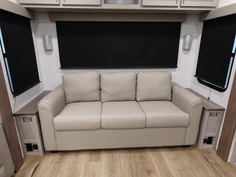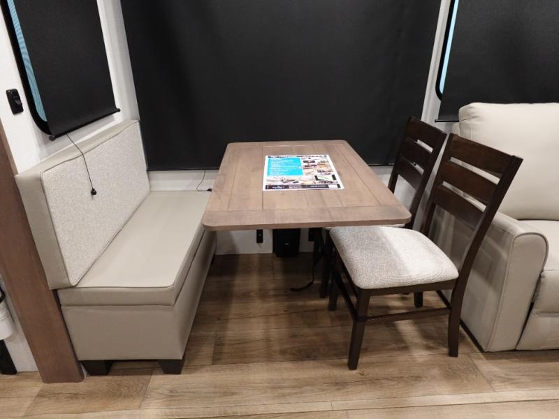 A kitchen island with countertop space makes it easy to prepare meals in this fifth wheel! The floating dinette table has two chairs on one side and a movable ottoman with flip up storage on the other side to keep your games or extra table cloths in. You can store your dishes and snacks inside the hutch/pantry or in the second pantry.There is also a dresser and large wardrobe for storage, and either side of the wardrobe with washer and dryer prep. The rear living area features a dual recliner theater seat across from an entertainment center with a 50" class HDTV with hidden storage behind it, and is also on a swing mount for all to see even at the rear sleeper sofa!