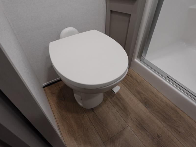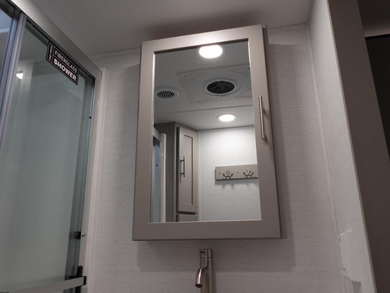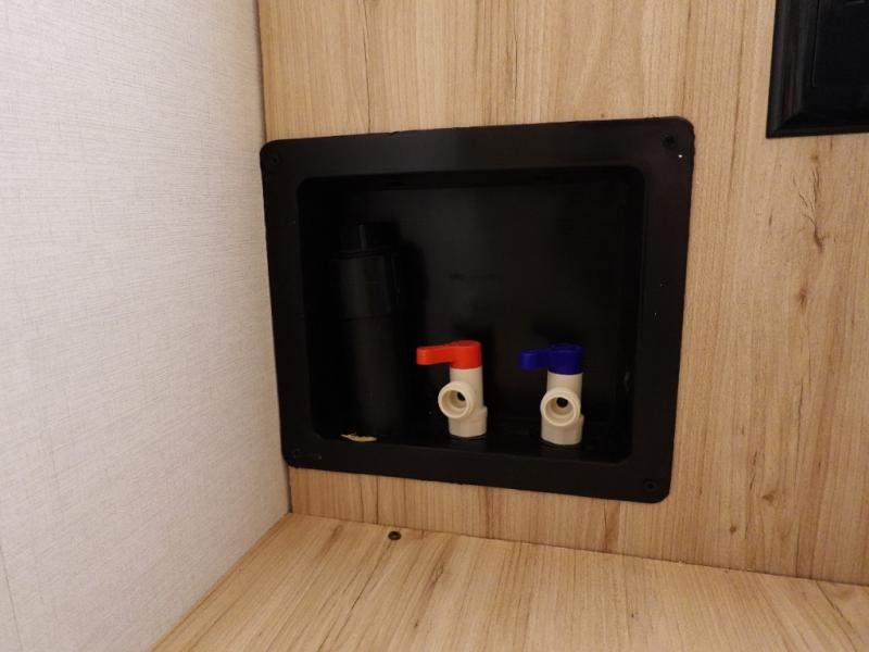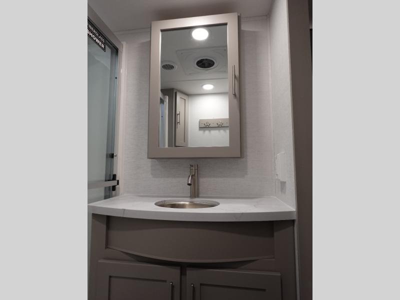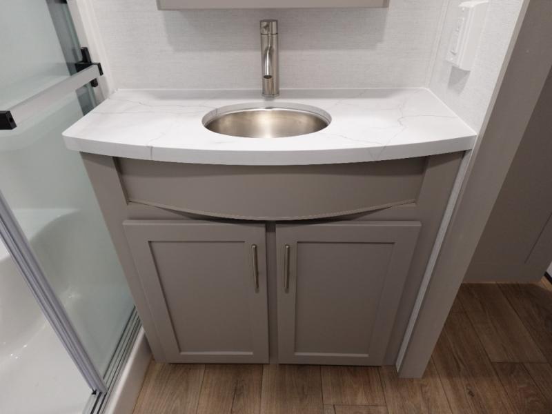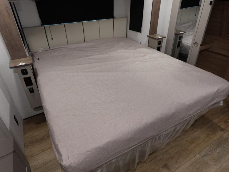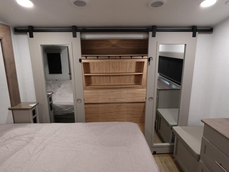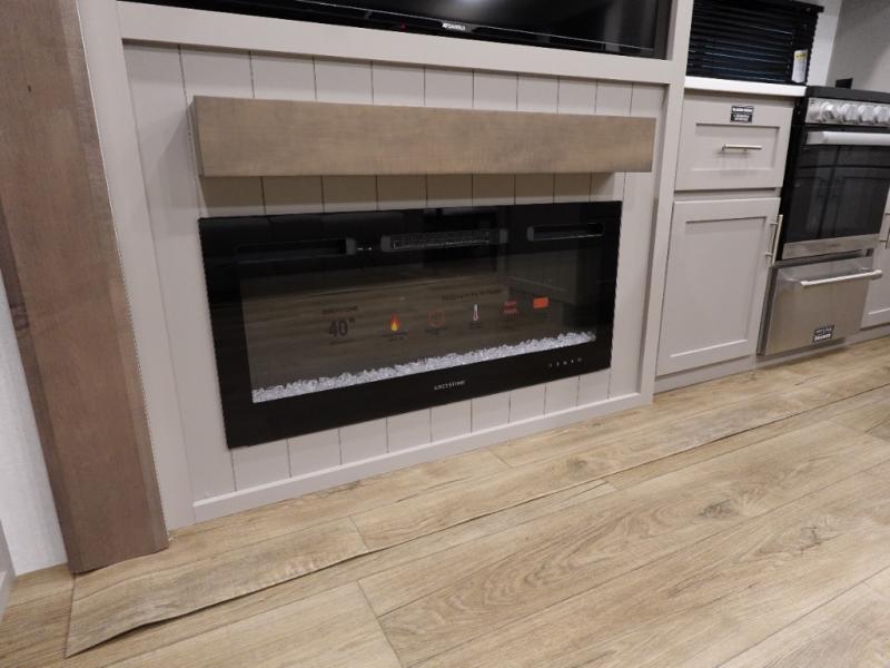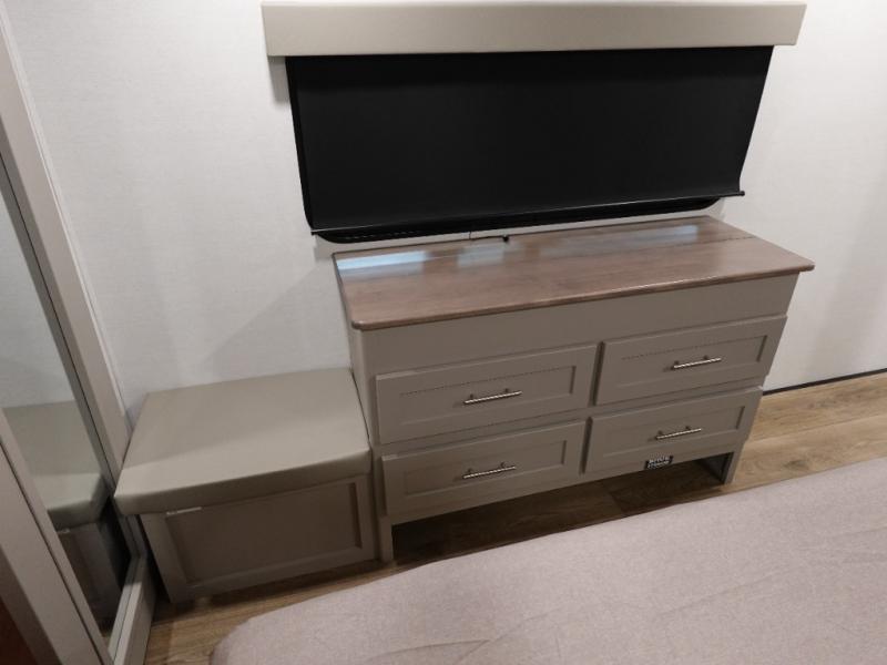 A kitchen island with countertop space makes it easy to prepare meals in this fifth wheel! The floating dinette table has two chairs on one side and a movable ottoman with flip up storage on the other side to keep your games or extra table cloths in. You can store your dishes and snacks inside the hutch/pantry or in the second pantry.There is also a dresser and large wardrobe for storage, and either side of the wardrobe with washer and dryer prep. The rear living area features a dual recliner theater seat across from an entertainment center with a 50" class HDTV with hidden storage behind it, and is also on a swing mount for all to see even at the rear sleeper sofa!