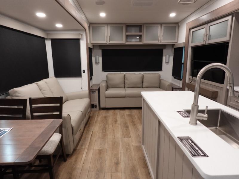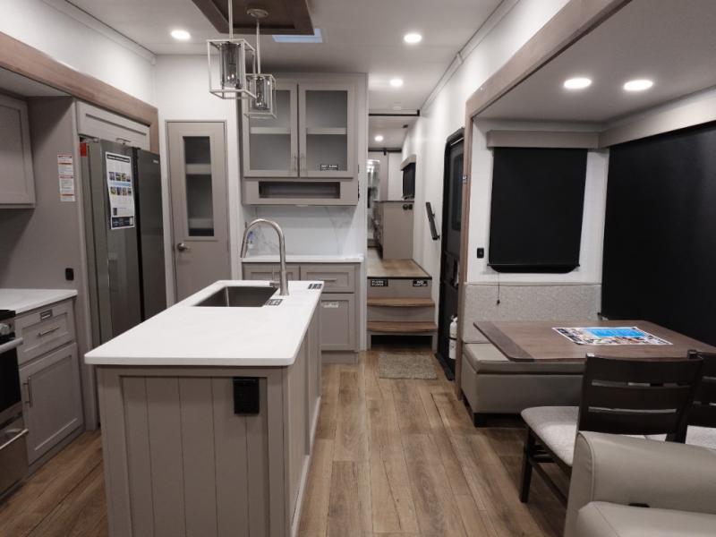 A kitchen island with countertop space makes it easy to prepare meals in this fifth wheel! The floating dinette table has two chairs on one side and a movable ottoman with flip up storage on the other side to keep your games or extra table cloths in. You can store your dishes and snacks inside the hutch/pantry or in the second pantry. There is also a dresser and large wardrobe for storage, and either side of the wardrobe with washer and dryer prep. The rear living area features a dual recliner theater seat across from an entertainment center with a 50" class HDTV with hidden storage behind it, and is also on a swing mount for all to see even at the rear sleeper sofa!