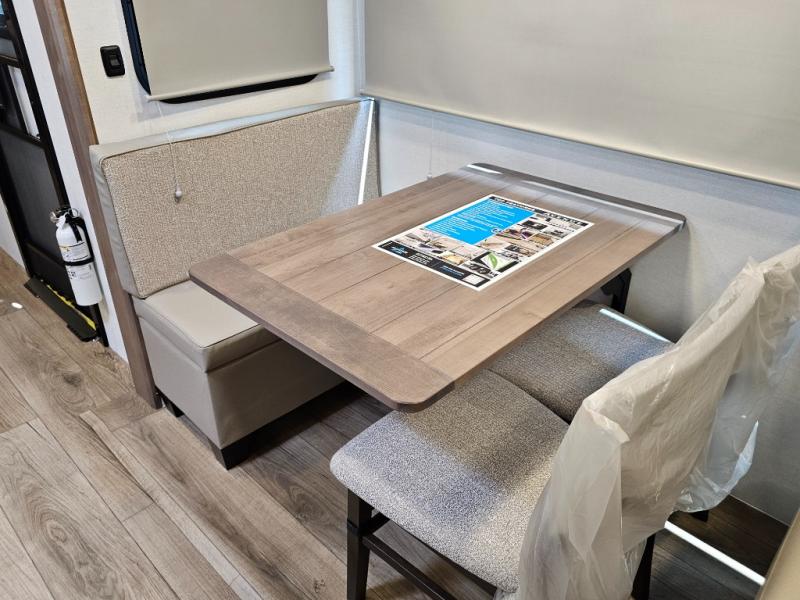 Floating Dinette Table: Includes two chairs and a movable ottoman with flip-up storage—perfect for games or linens.